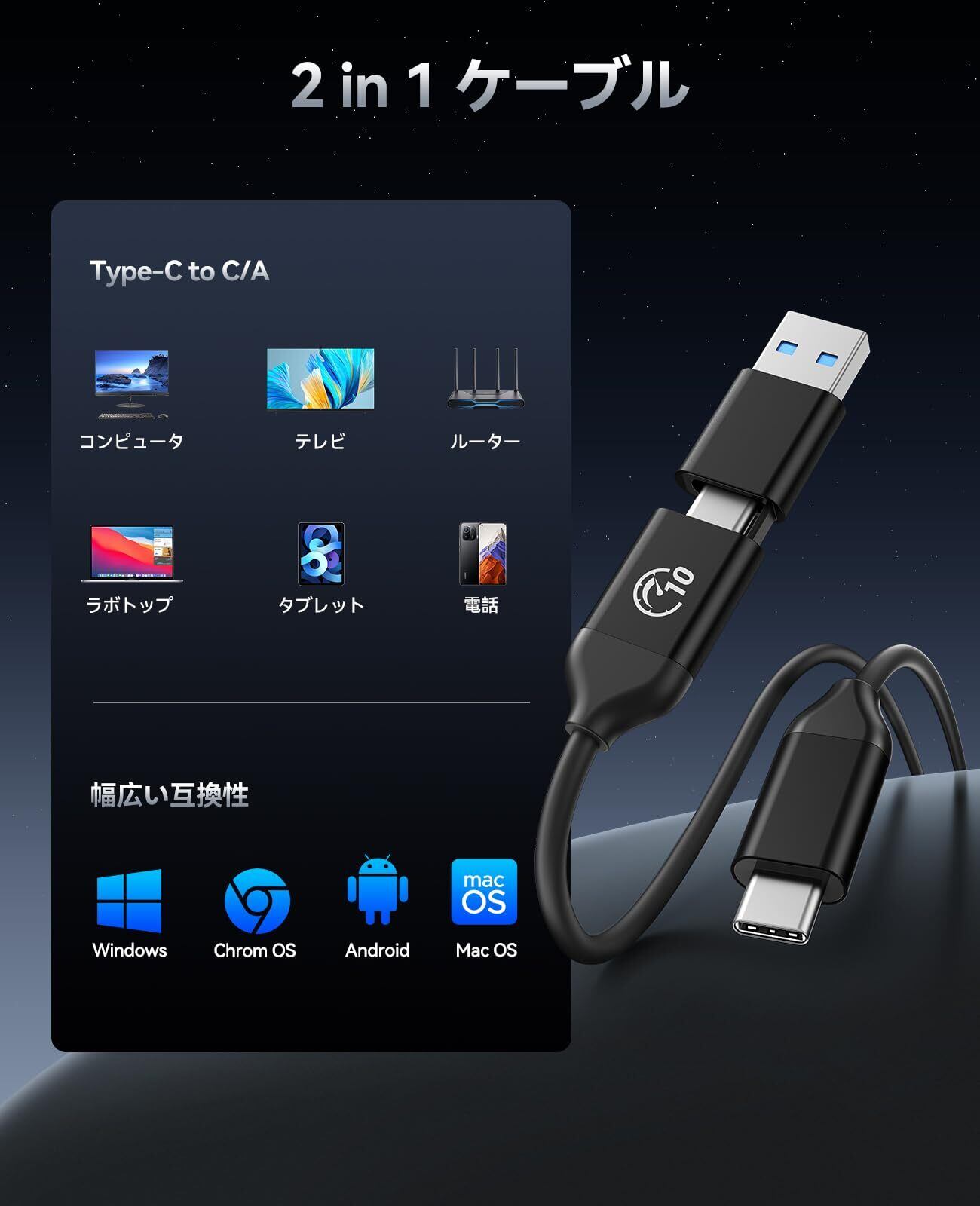 【2 in 1ケーブルで多デバイス対応】付属のUSB-C to C/A 2 in 1ケーブルにより、Windows/macOSパソコンはもちろん、Androidスマホ・iPad・ゲーム機など幅広い端末にプラグ&プレイ。面倒な設定なし即挿即用ですぐに使用可能。