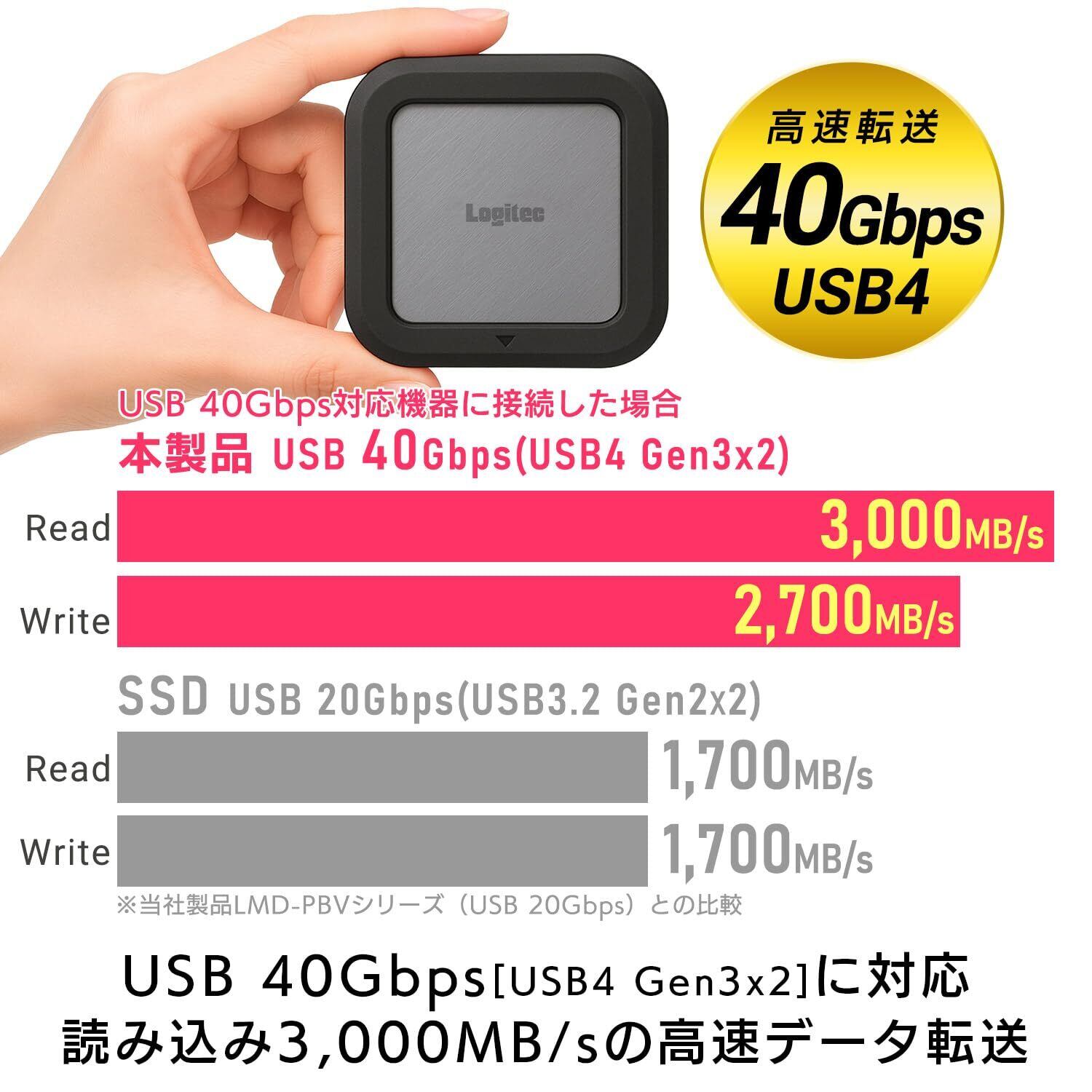 ロジテックダイレクト 40Gbps USB4対応 外付け SSD 2TB Type-C R:3,000MB/s W:2,700MB/s PS5 / PS5 Pro 動作確認済 USB4(Gen3x2) ポータブル LMD-PBW020U4CBK