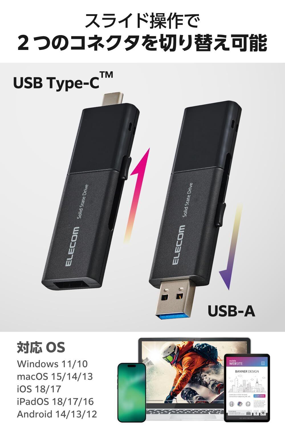 **エレコム 外付けSSD 1TB USB3.2 (Gen1)対応 スライド式 Type-C/Type-A コネクタ iPhone/iPad 対応 ブラック ESD-EAWB1000GBK**