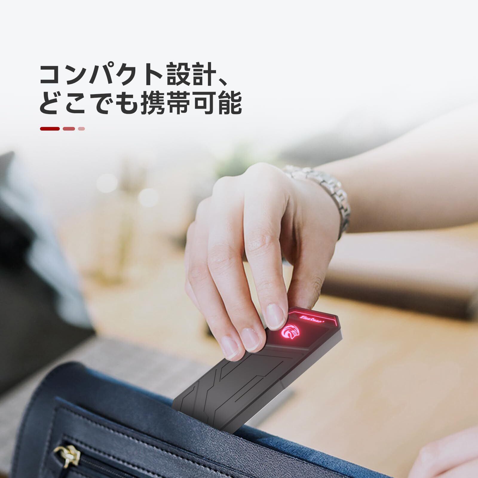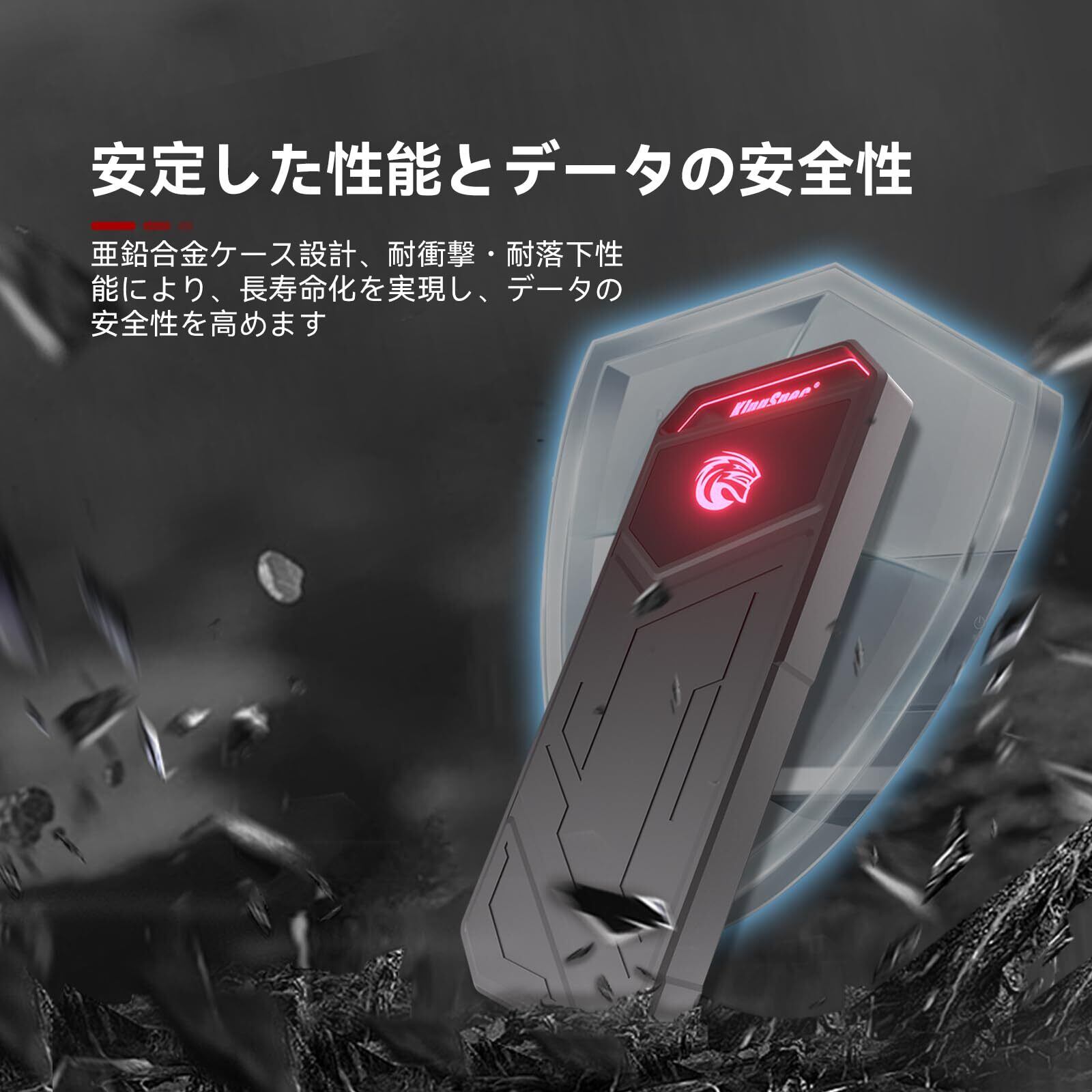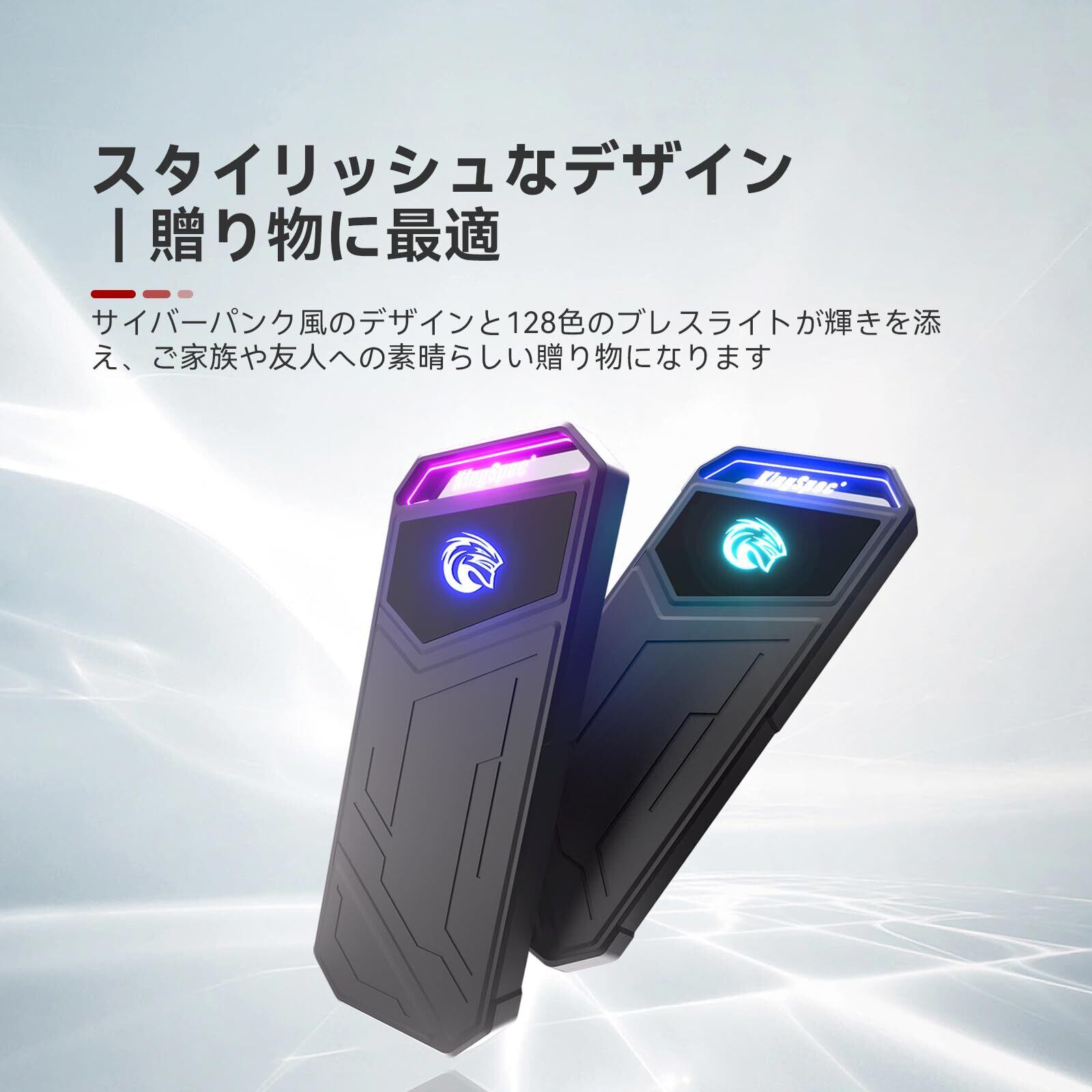 「この外付けSSDには、RGBライトが搭載されており、使用時に美しいライトアップが楽しめます。デザイン性に優れた外観が、デジタル環境をさらに魅力的に演出します。」