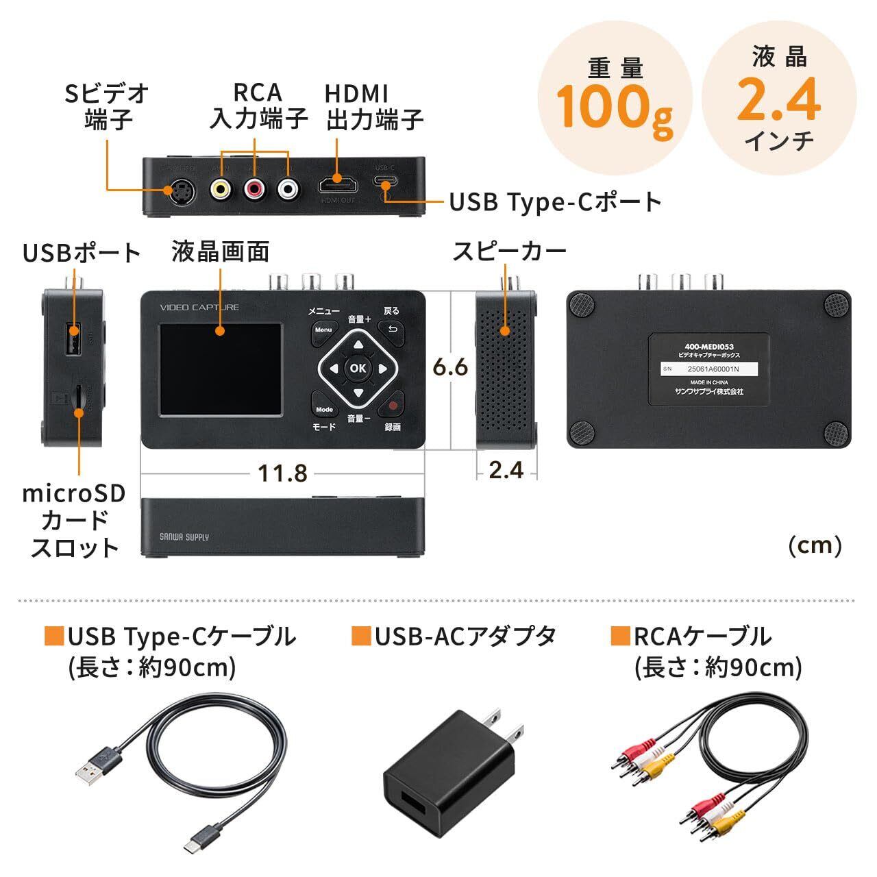 サンワダイレクト ビデオキャプチャー キャプチャーボード PC不要 RCA入力 VHS/8mmビデオテープ 録画 デジタル化 microSD/USB保存 2.4インチモニター付き 400-MEDI053