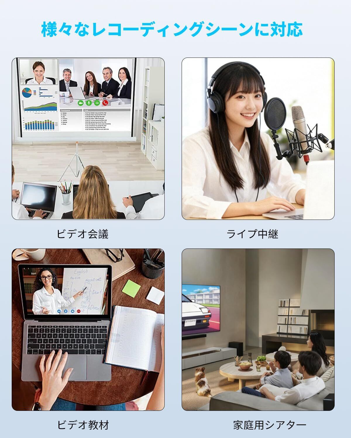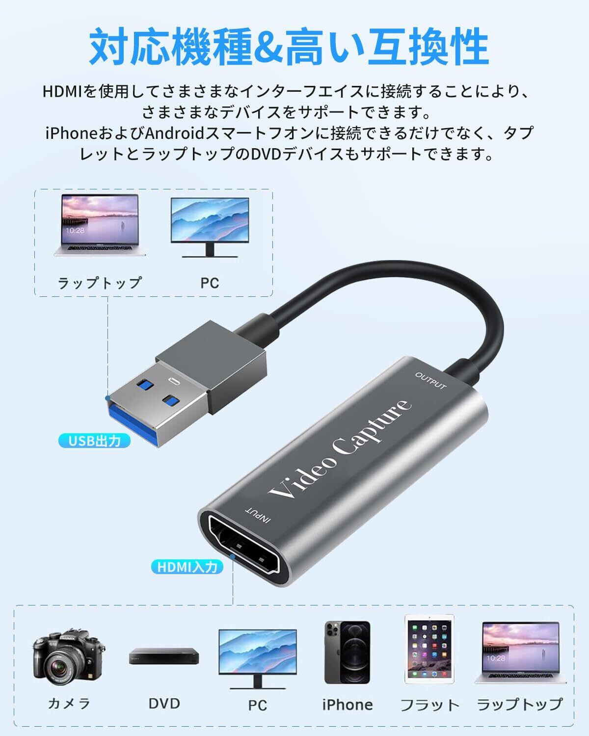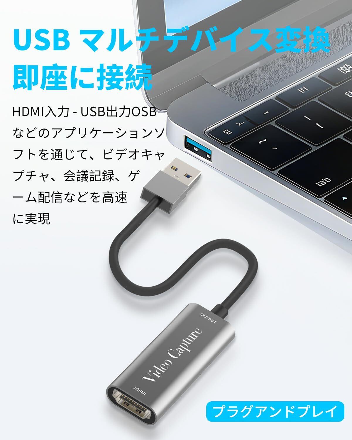 「USB接続で、特別な電源不要!パソコンやノートPCにサッと接続するだけで、面倒な設定は一切ありません。すぐにゲームのプレイを録画したり、配信を開始したりできます!」