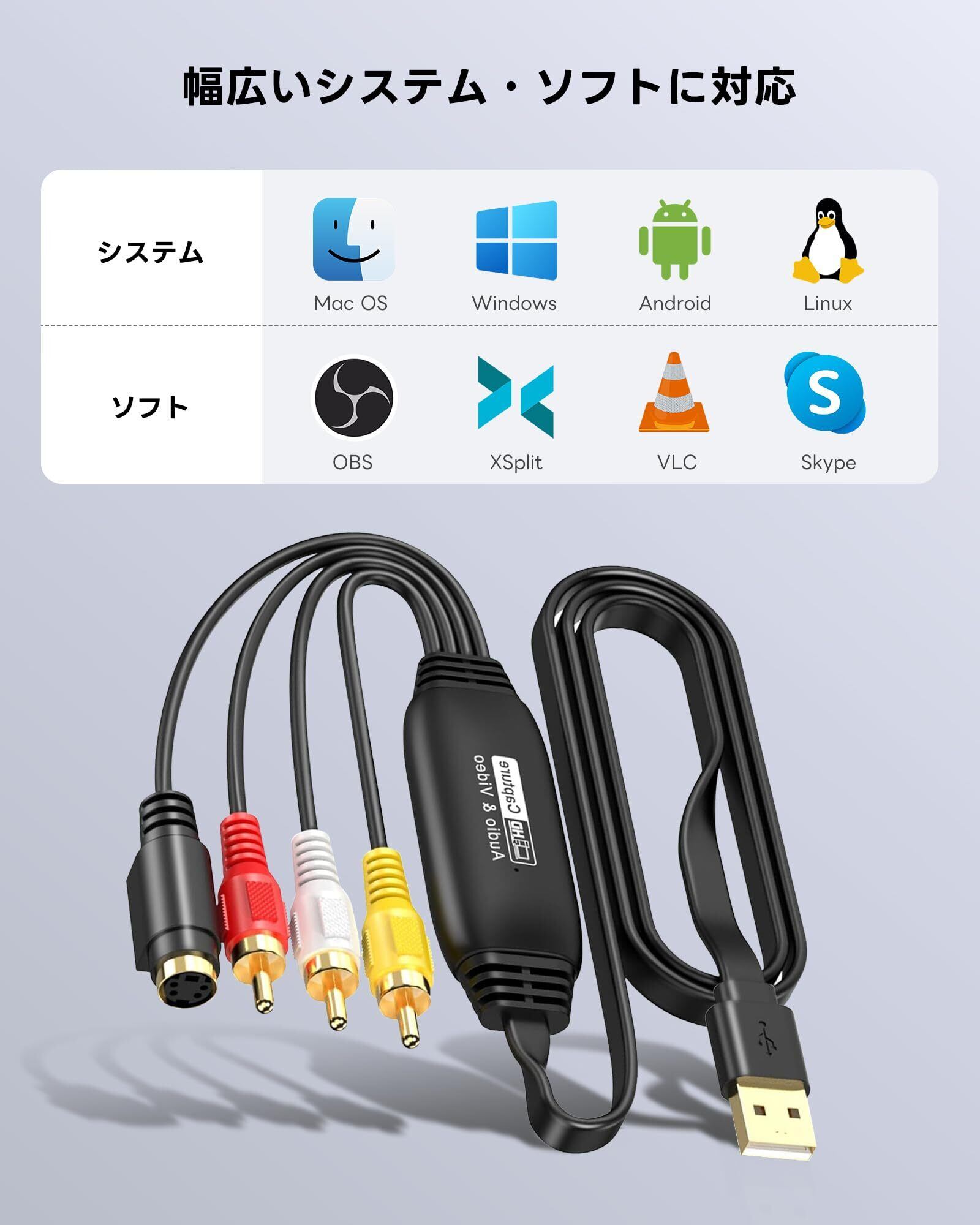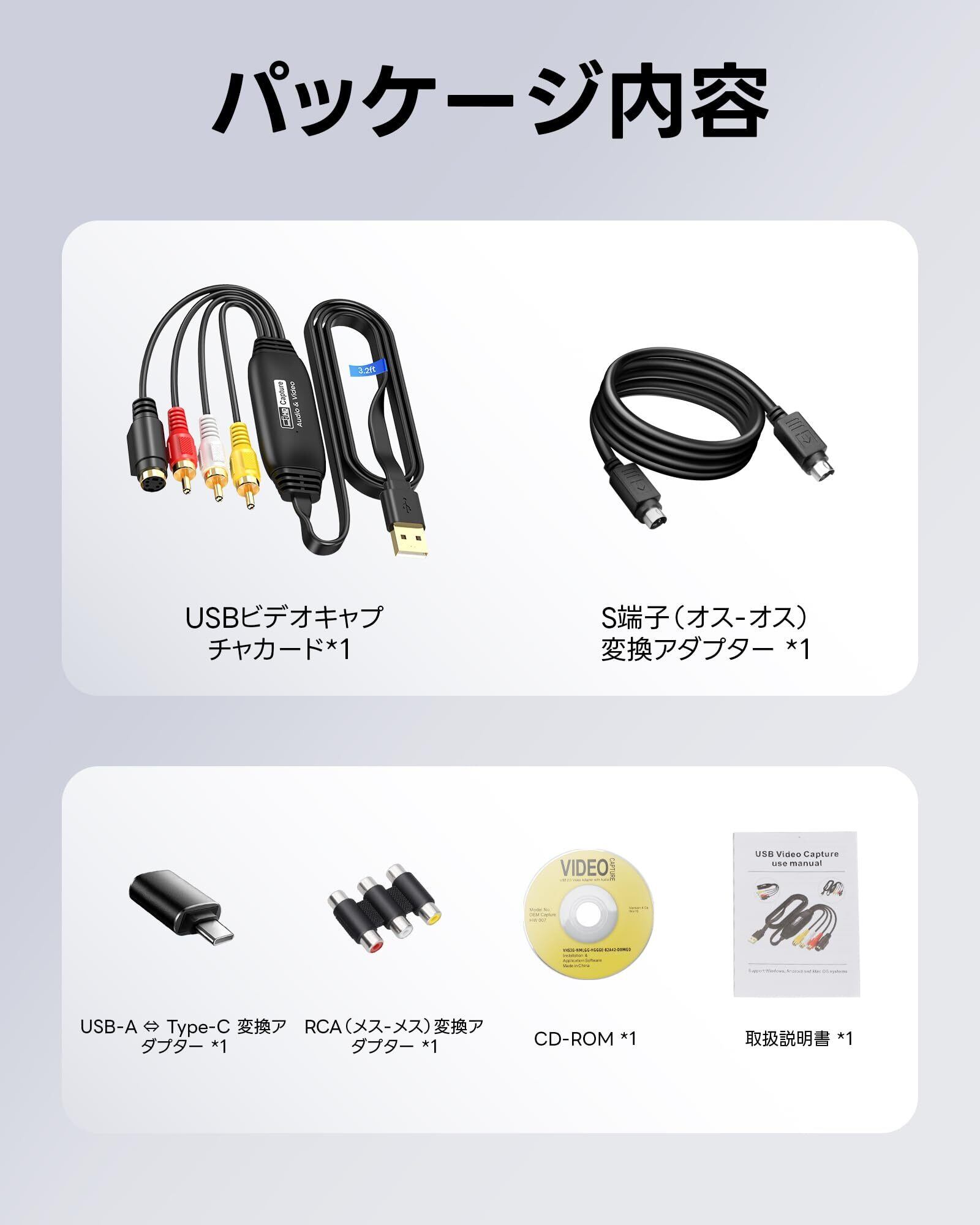 - USB変換アダプターやS-Videoケーブル、CD、RCAアダプターが付属し、使いやすさを追求!
