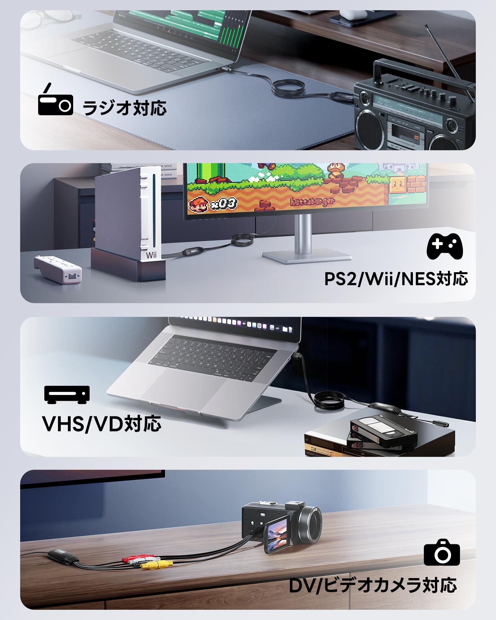 「USB2.0接続によるシンプルなプラグアンドプレイ設計で、WindowsおよびMacに対応。特別なドライバをインストールせずにすぐに使用できます。映像の取り込みや編集が スムーズに行えるため、初心者でも安心です!」