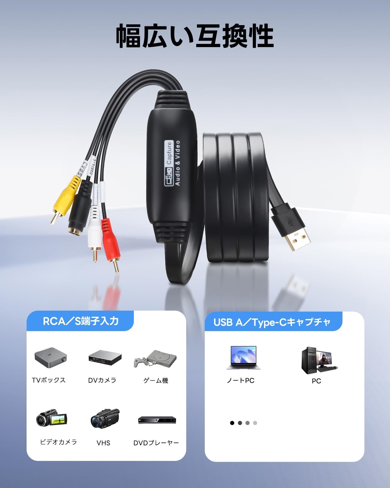 【安定した接続と幅広い互換性】 本製品はRCA(コンポジット)入力とS-Video入力に対応し、USB2.0または付属のType-C変換アダプターで接続できます。ノートPCやMacでも安定して映像をキャプチャーでき、VHS、VCR、8mm、DVDプレーヤーなど幅広い機器に対応しています。映像入力はRCAとS-Video各1系統、音声入力はRCA(右/左)1系統です。