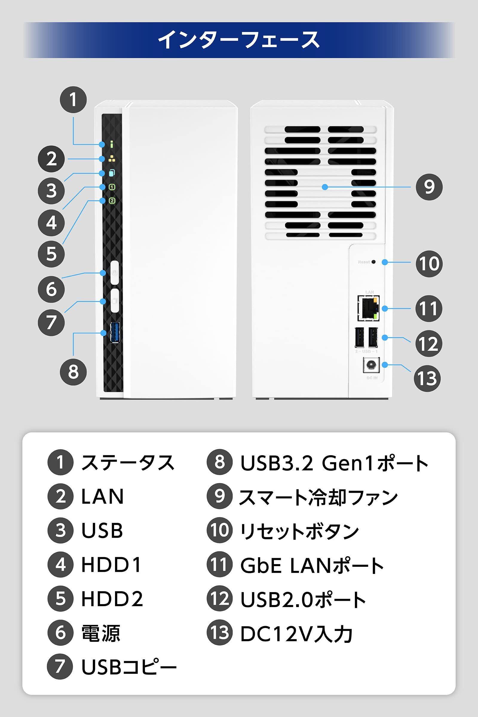 LEDインジケーター:システムステータス、LAN、USB、HDD1~2