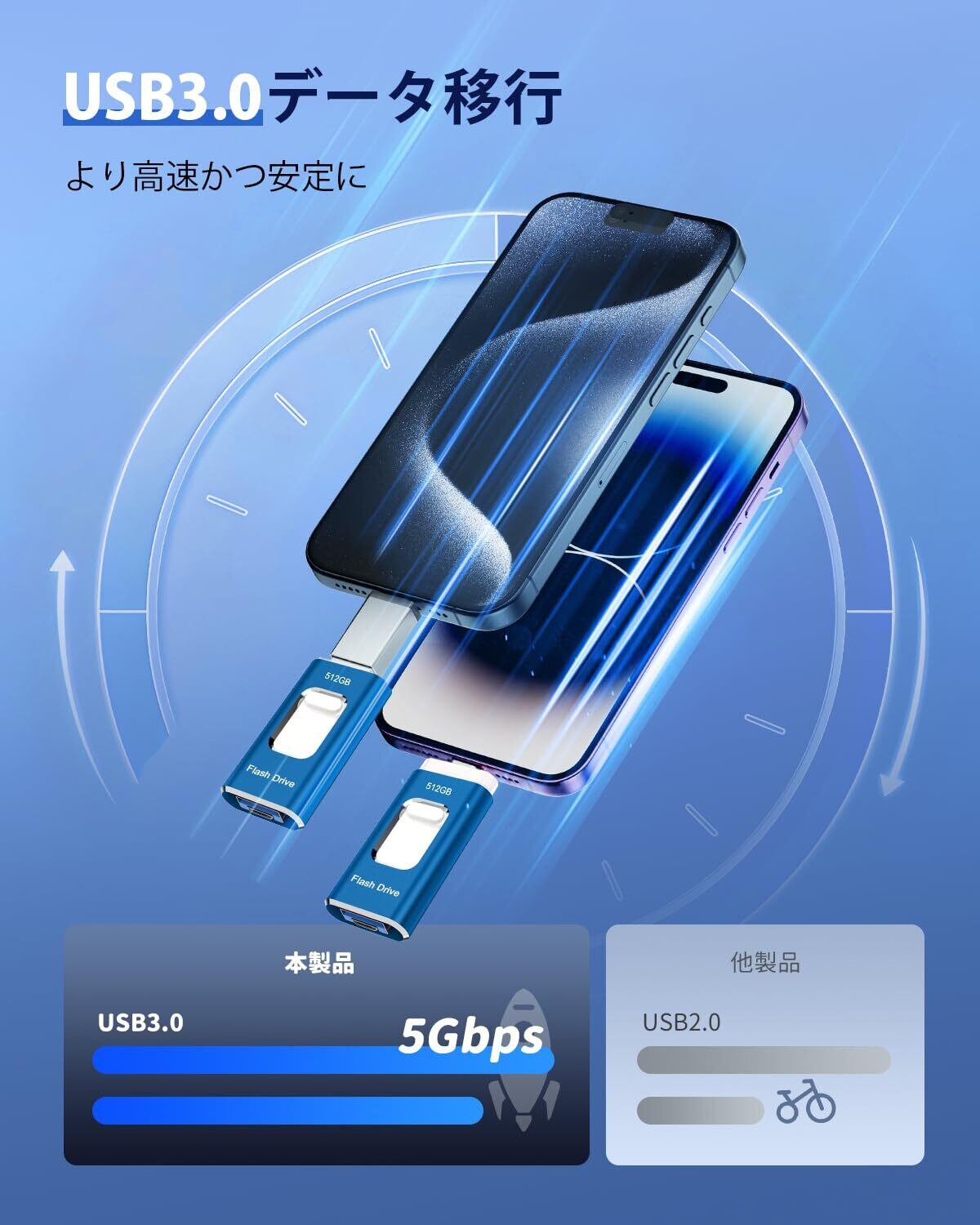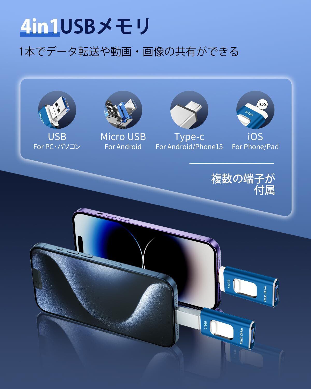 512GB USBメモリー【アプリ不要】4in1 phone対応usbメモリ高速USB 3.0 IOS/USB/Type-C/micro usb フラッシュメモリ type-c USB メモリーphoneデータ 転送保存 写真 バックアップアイフォン用 外付けメモリIOS/Android/Win/MAC対応 携帯容量不足解消(ブルー)