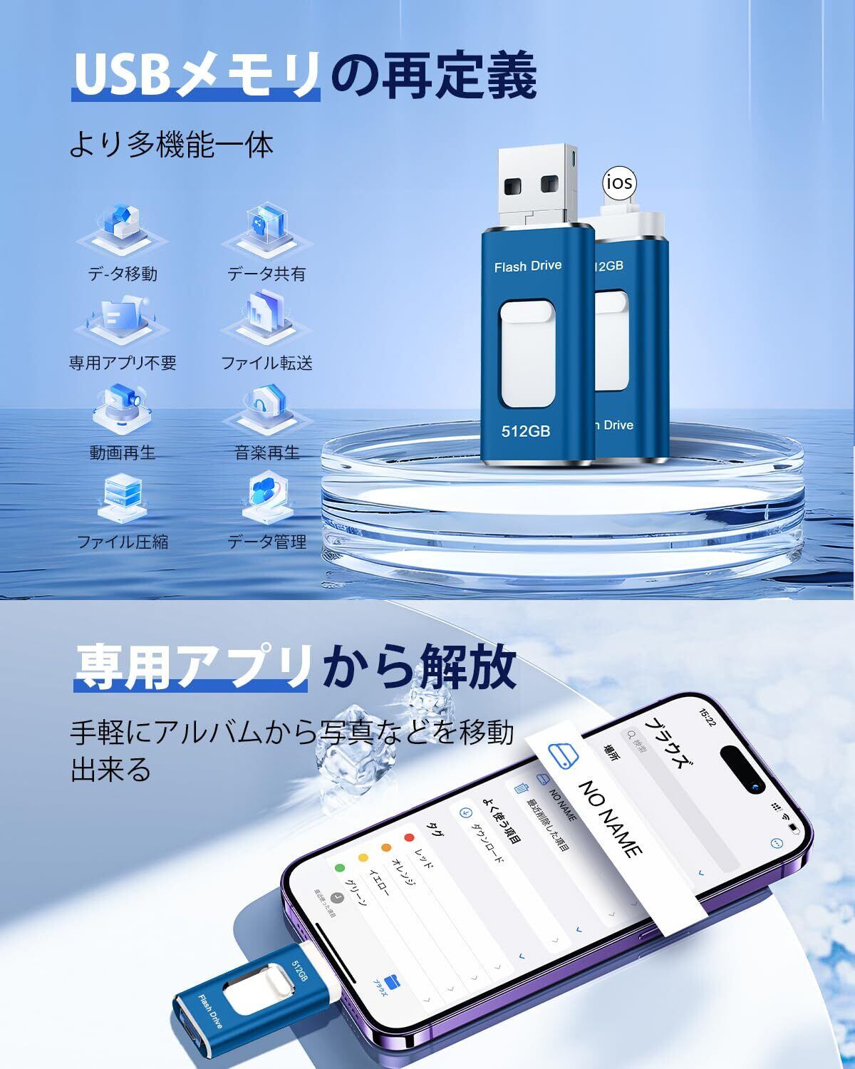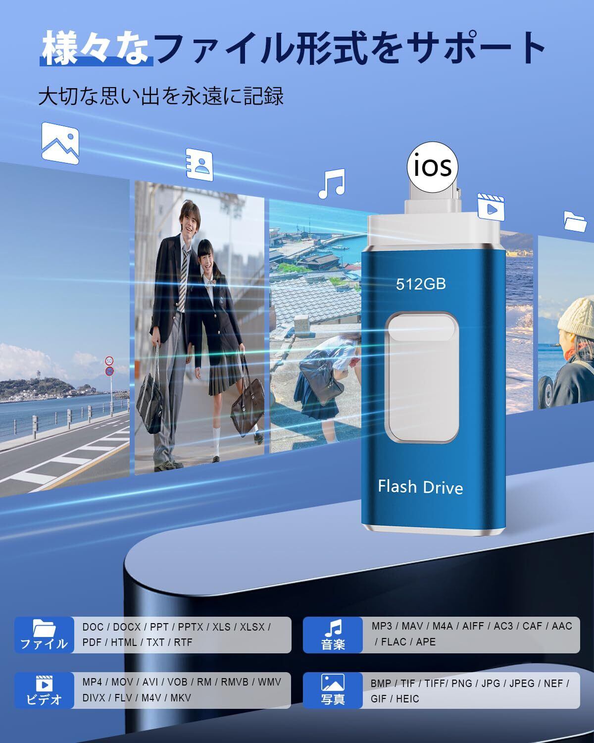 「この『512GB USBメモリー』は、大容量512GBを搭載した便利な4in1フラッシュメモリです。USB 3.0規格に対応しており、iOS、USB、Type-C、Micro USBにすぐに接続できるため、簡単にデータを移行・保存することができます!」