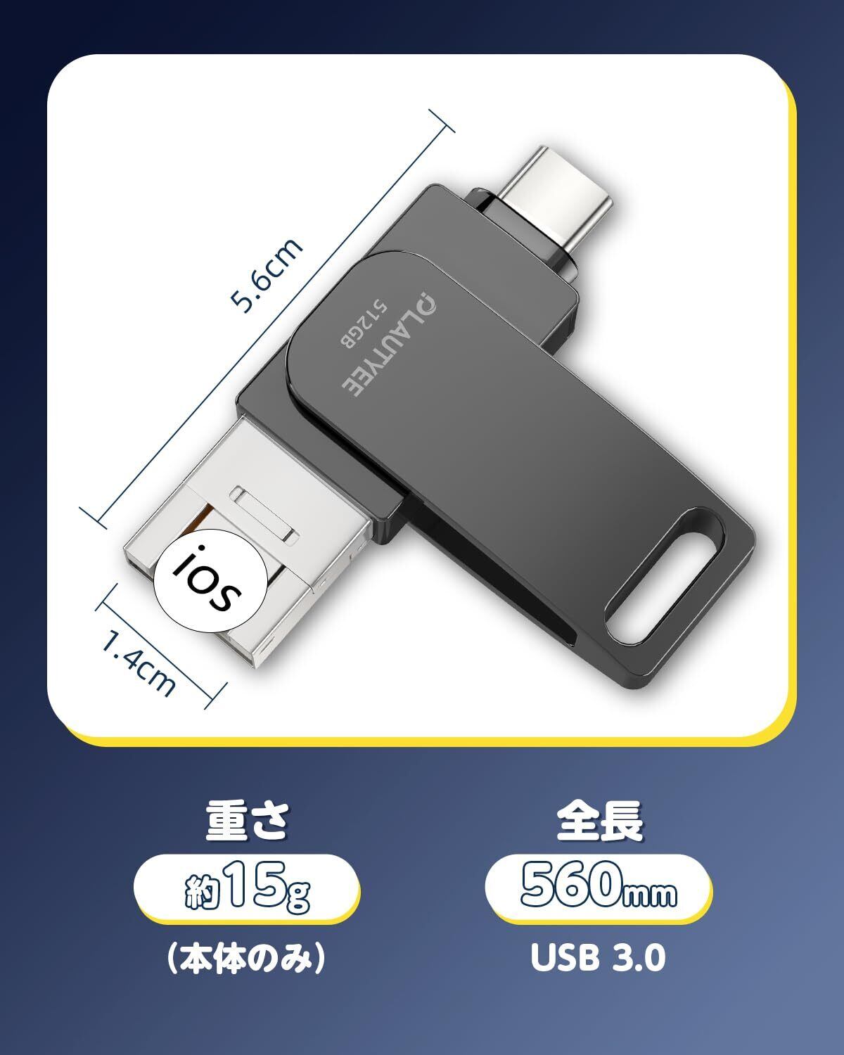 【業界初 アプリ不要!】この革新的なUSBメモリは、業界で初めて完全なAPP不要設計を実現しました!専用アプリや面倒な設定は一切不要。PhoneやAndroidに接続するだけで自動的に認識されます、すぐにデータの保存・転送が可能です。また、オペレーティング システムが Windows、macOS、Android のいずれであっても、どのデバイスでもシームレスに実行されます。【次世代4in1 多機能USBメモリ】転換アダプター不要の革新的設計!煩わしいアダプターの持ち運びから解放!1台でTypeC端子・IOS端子・USB端子・microUSB端子を備えており、 PCとスマートフォン間のデータのやり取りが自由自在。