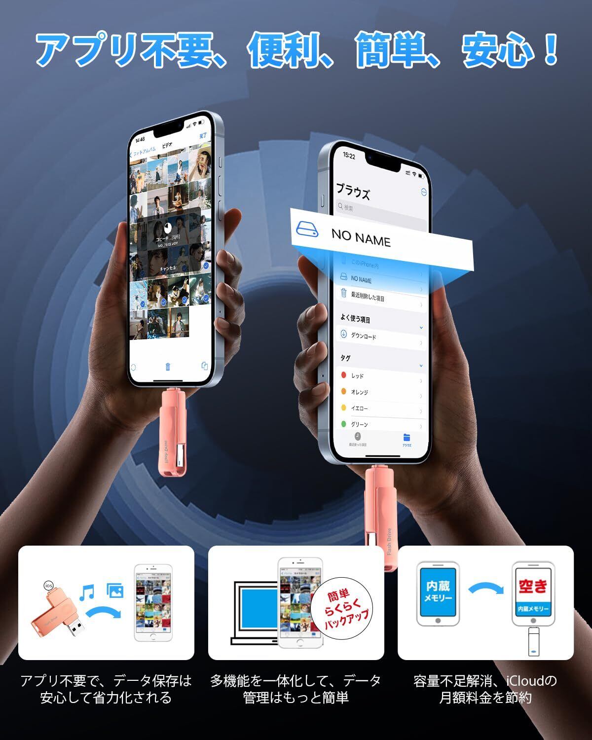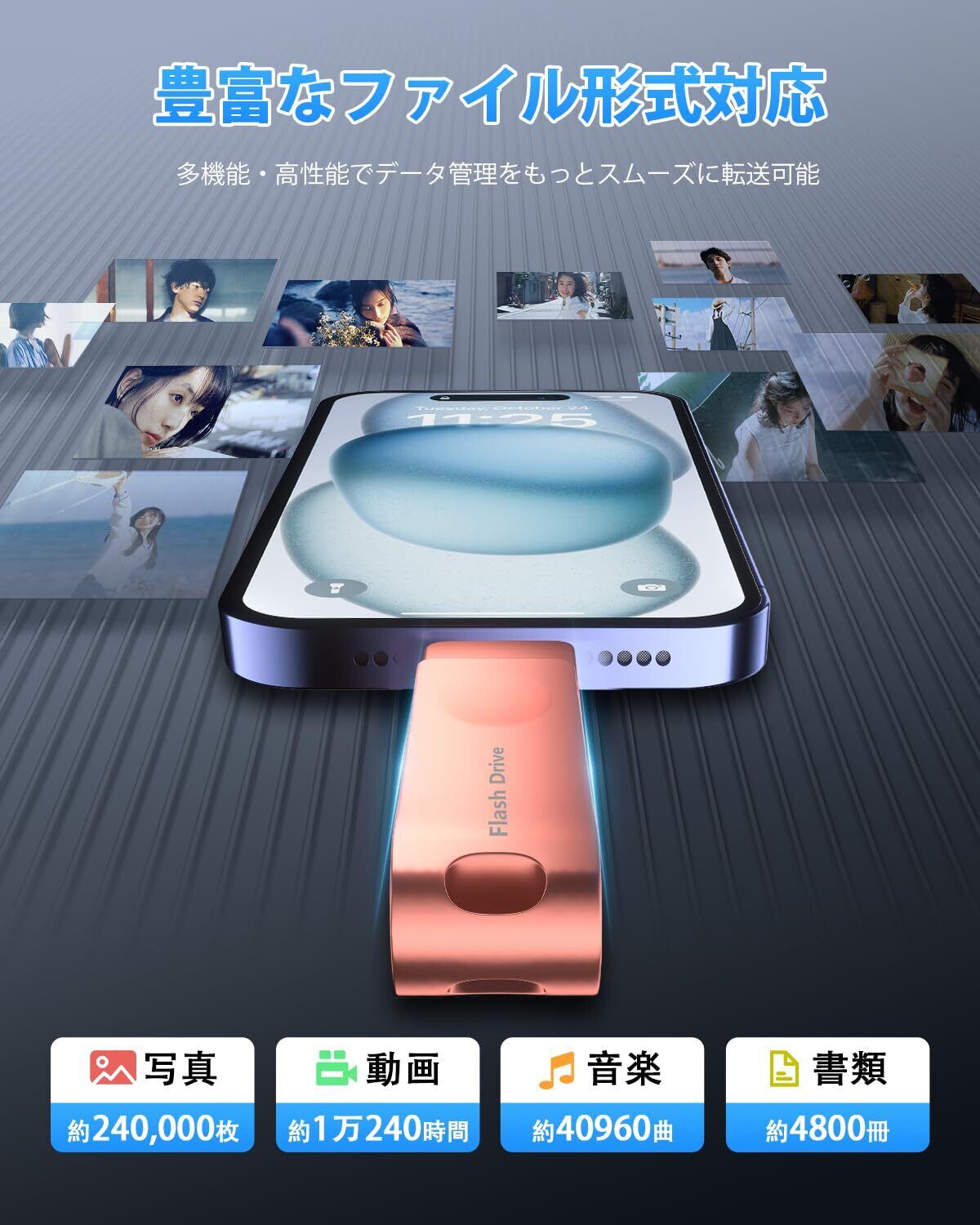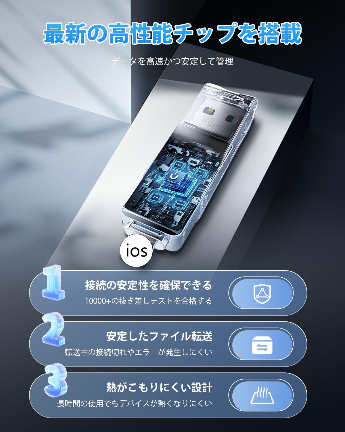 【4in1・多機能usbメモリー】USBメモリはiOS、Type-C、USB、Micro USBの四つのコネクタを搭載し、Phone、iPad、パソコンからテレビやプリンターまで、ほとんどの機種と互換性があります。アプリ不要のUSBメモリをご利用いただき、スマホの容量不足を解消できて、写真保存・データ保存の機能も果たすことができて、データ移行、データ管理、ファイル移動、データ共有やファイル圧縮などの機能も搭載されます。