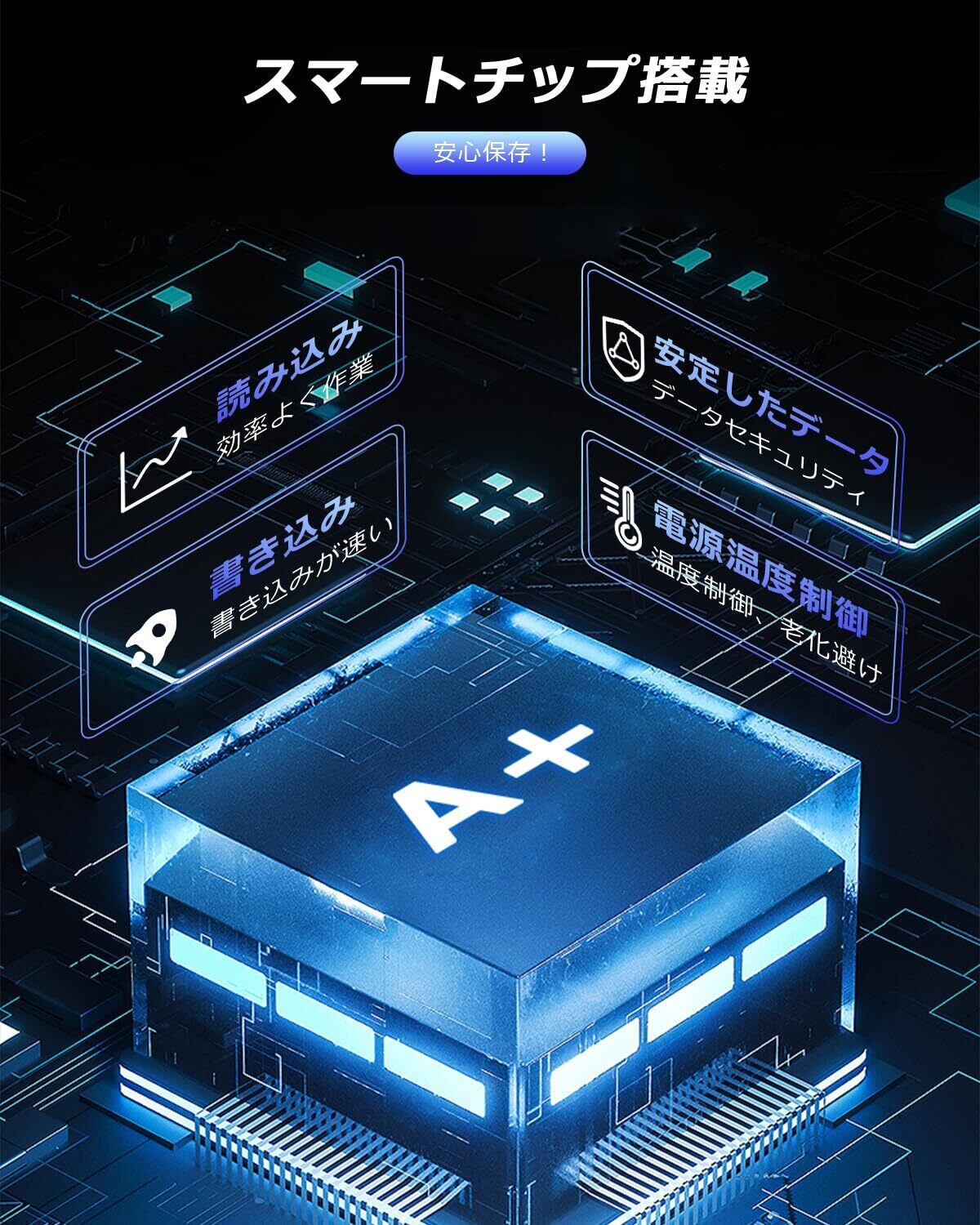 【スマートチップ搭載 長く使えるこだわりの安全設計!】独自の多重保護システムにより、電子基板保護機能・データ損失防止機能・過電圧・過電流防止機能、短絡保護機能、温度検知保護等の6つ安心の回路設計を備えました。いつでも安心安全にご利用いただけ、あなたのデータを守ります!