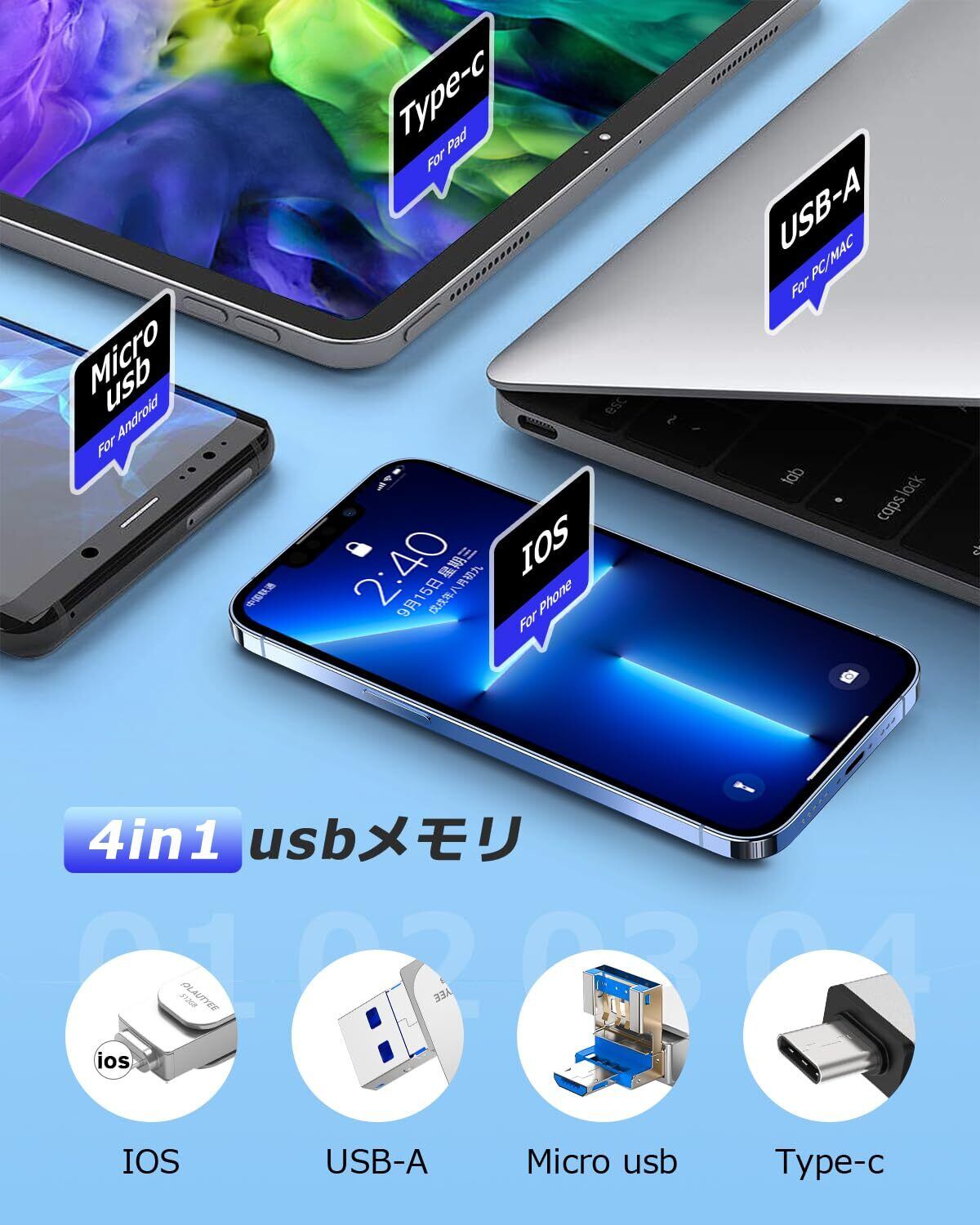 【待望のアプリ不要が新登場!!】専用アプリ必要なし、PhoneUSBメモリーが最新の技術を採用し、専用アプリをダウンロードすることも必要なくて、挿入するだけで簡単操作、データ自由自在に送信/点検/動画/画像/資料などの編集出来ます。IOS・USB・Type-C・Micro usb端子がある、一台4役のUSBメモリーです。Phone・Pad・PC・Andordなどで使用できます。ほぼすべての機器に対応!