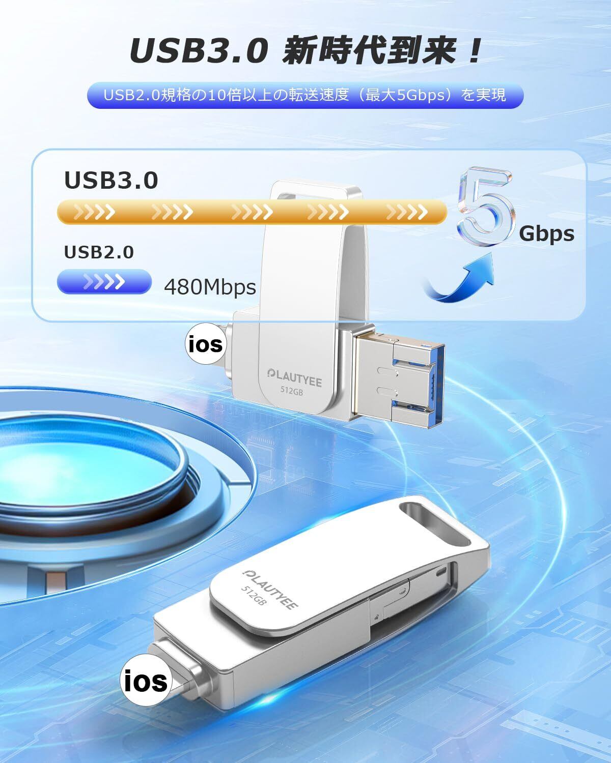 「この『アプリ不要 512GB USBメモリ』は、USB3.0高速転送に対応した便利なフラッシュメモリです。アプリのインストールが不要で、スマートフォンから直接簡単にデータを保存できます!」