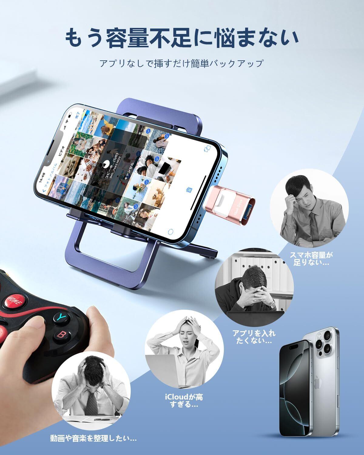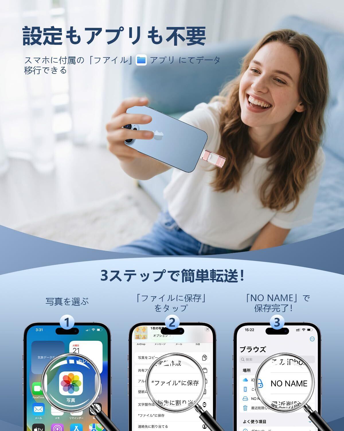 【専用アプリ不要、全面的にアップグレード!】専用アプリをダウンロードしないと使えない?最新技術でアップグレードされた新版のiPhone対応USBメモリは、専用アプリをダウンロードせずにデータを移行できて、専用アプリから解放します。USBメモリーをスマホに挿入するだけで、写真や動画などをスマホのアルバムからUSBメモリに保存できて、スマホに付属している「ファイル」アプリではUSBメモリーに保存されているデータを確認できます。