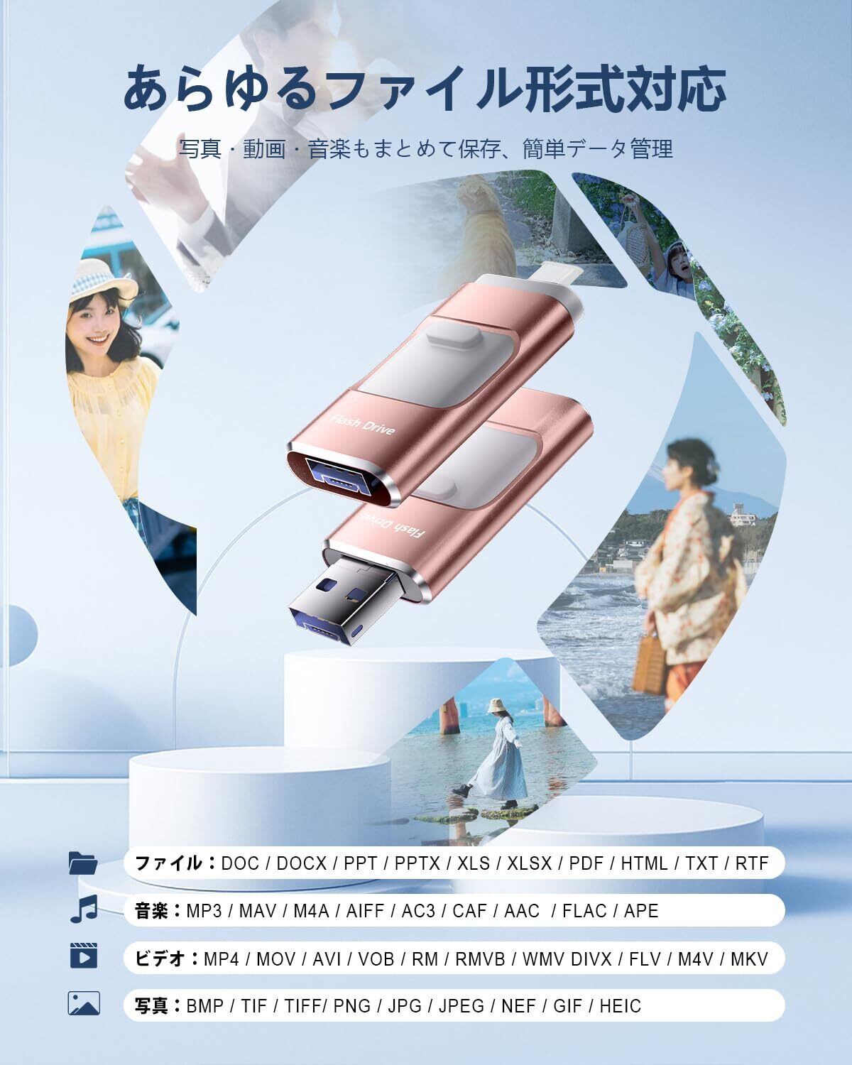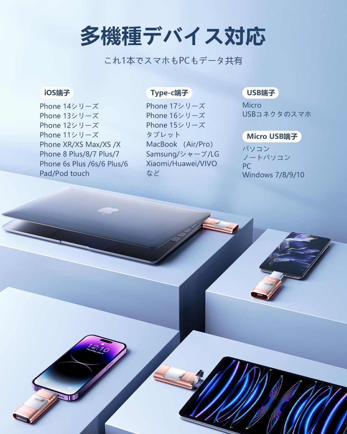 【高い互換性】本iPhone対応USBメモリーはすべてのPhone、iPadシリーズに対応いたします。Type-Cアダプターも付属しておりますので、Type-CコネクタのiPad、Phone、MacBookとも互換性があります。Phone 15 Pro Max/15 Pro/15 Plus/15/14 Pro Max/14 Pro/14 Plus/14/SE 3/13 Pro Max/13 Pro /13/13 mini /12 Pro Max/12 Pro/12 /SE 2 /11 Pro Max/11 Pro/11 /XR/XS Max/XS /X /8 Plus/8/7 Plus/7/SE 1/6s Plus /6s/6 Plus/6/ iPad Pro(第1/2/3/4/5/6世代)/ iPad Air(第1/2/3/4/5世代)/ MacBook(Pro/Air)/ iPad mini(第1/2/3/4/5世代)/ iPad(第5/6/7/8/9/10世代)/ PC /ノートパソコン/ Type-Cスマホ/ タブレットなどと互換性があります。
