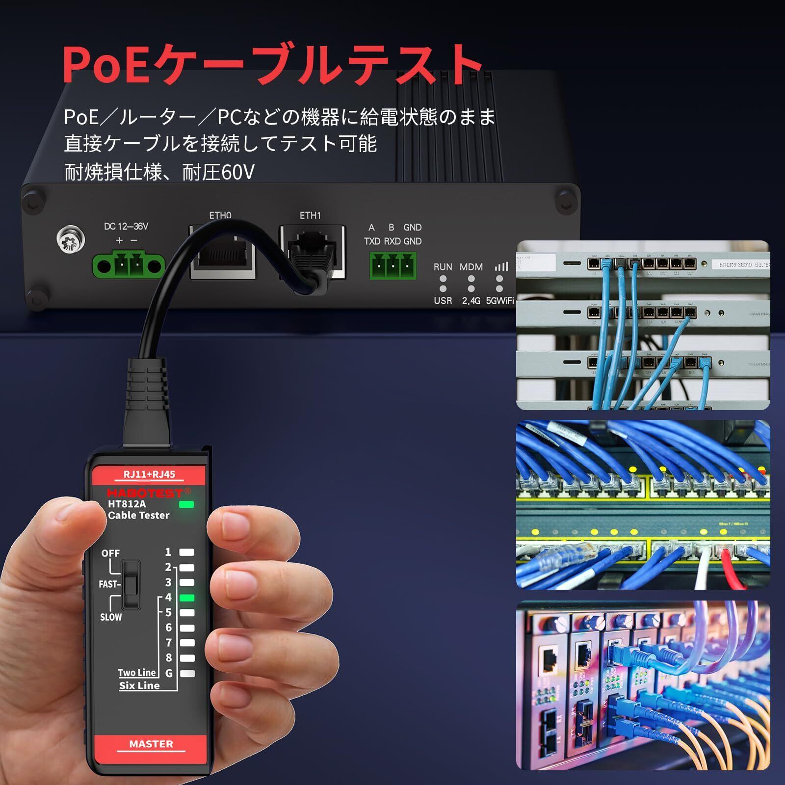 LAN電話線対応 2 in 1 ケーブルテスター :この2in1 lanテスターは RJ45 + RJ11 共通インターフェースを搭載し、8P/FTPシールド・非シールドLANケーブル6P/4P/2P 各種電話線のテストに対応しています。差し込むだけで即座に診断でき、複雑な設定は不要です