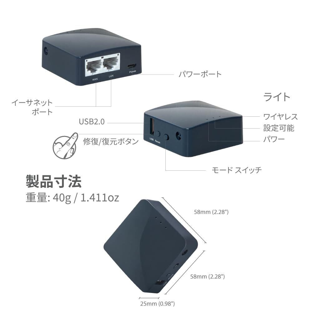 【ワイヤレス モバイル ミニ トラベル ルーター】わずか 40gで、持ち運びに便利、ポケットに入れやすい。ご使用の前に、最新のファームウェアをアップグレードしてください!【何らかの不明な点等ございましたら、サポートセンターとご連絡ください:[email protected]。】