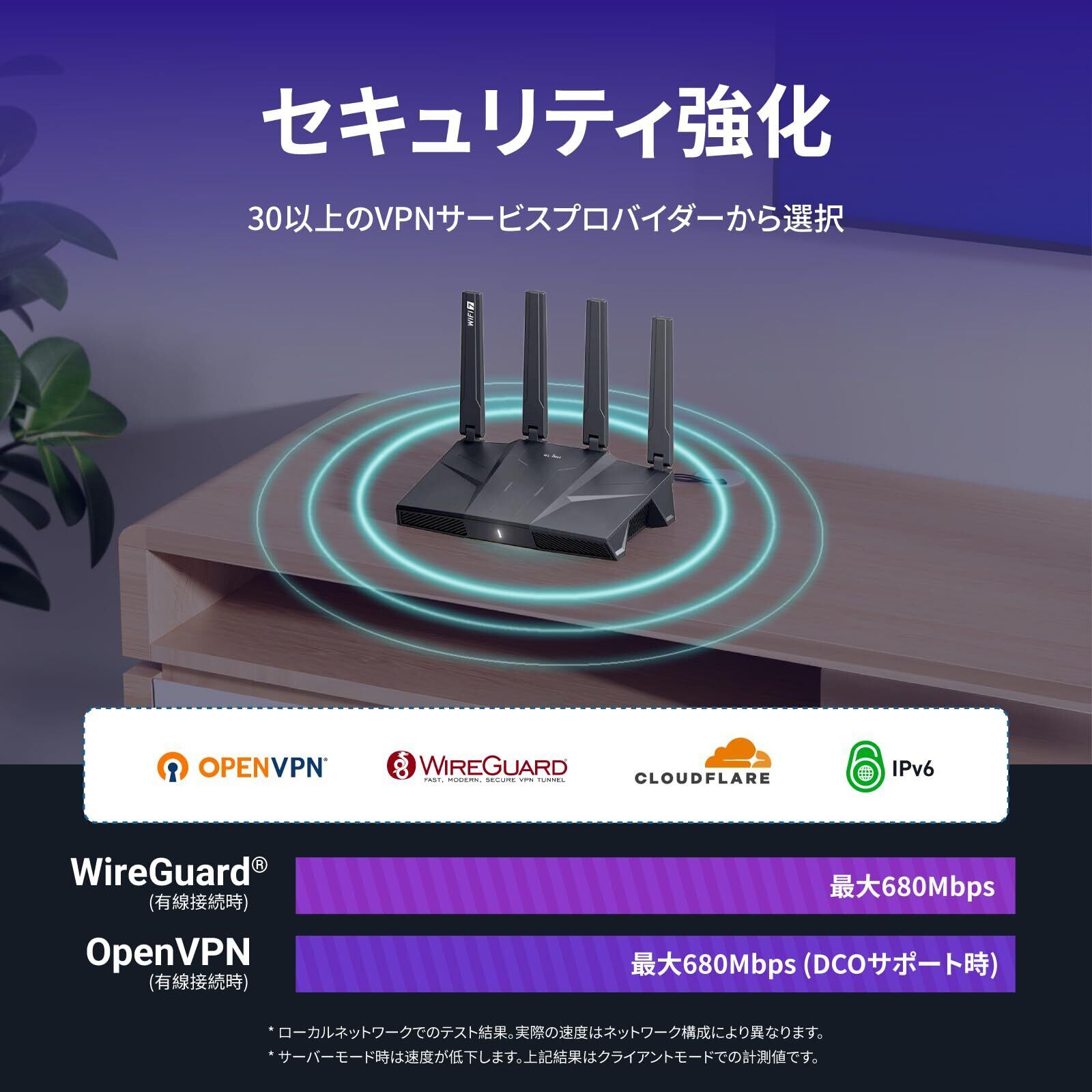 「OpenVPNおよびWireGuardに対応し、快適かつ安全な接続環境を提供します。MLO技術による多様な端末接続も可能で、セキュリティも強化されています。」