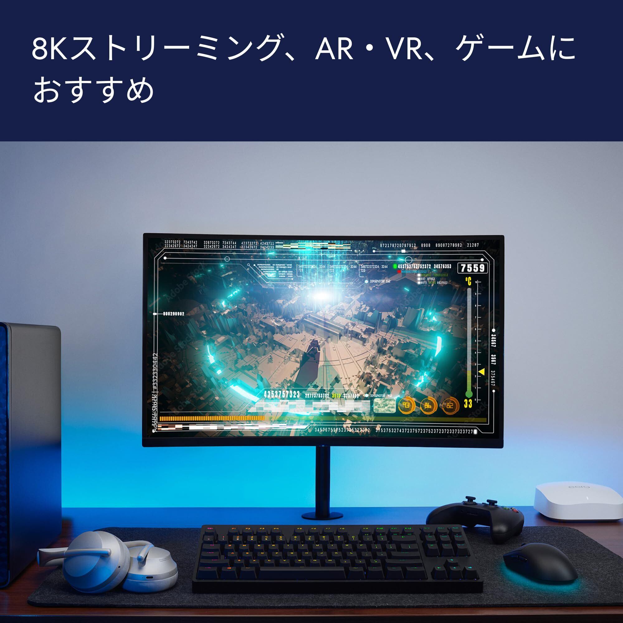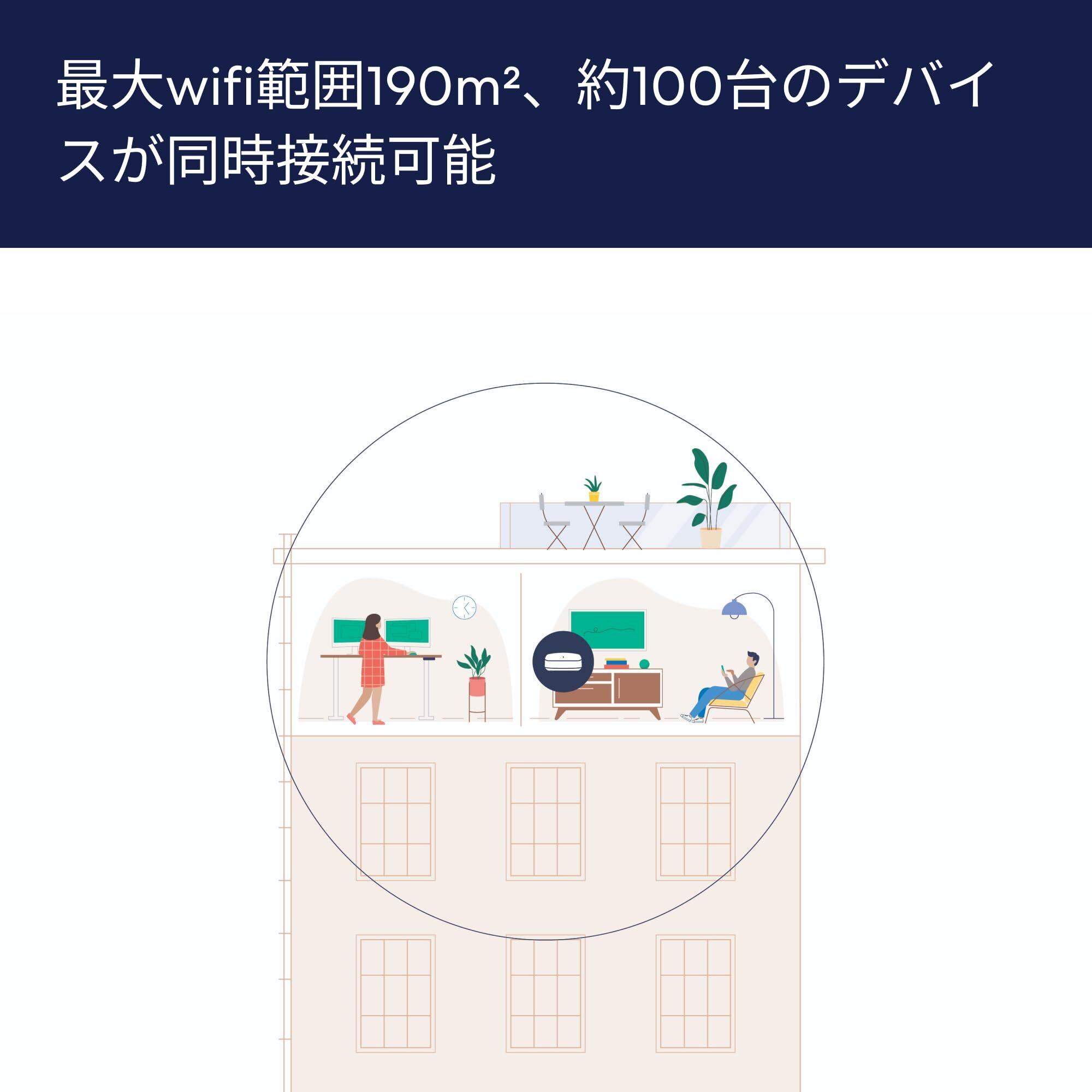 「複数ユニットでの使用が可能なメッシュ技術を採用しており、家全体に均一な Wi-Fi 信号を提供します。デッドゾーンを解消し、テレワークや家庭内のエンターテインメントをサポートします。」