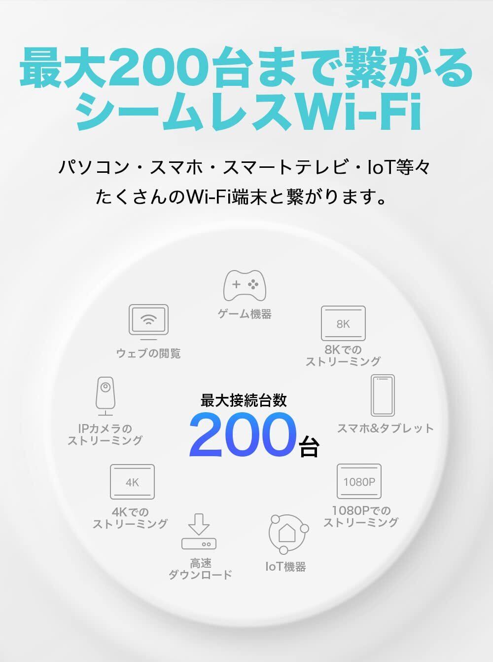 「複数ユニットでの運用が可能なメッシュ技術により、家中どこでも強力なWi-Fi信号を提供します。デッドゾーンを解消し、ストレスフリーなインターネット環境をお楽しみください。」