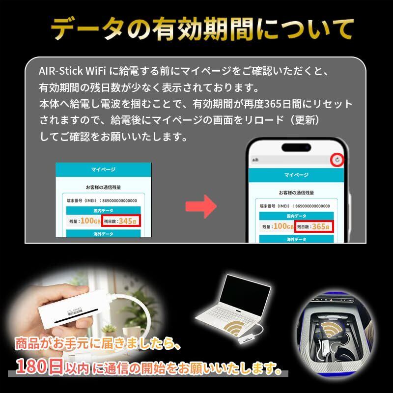 USB型WiFi リチャージ AIR-Stick WiFi 100GB付き 365日 モバイルルーター バッテリーレス 給電式 車載対応 買い切り型 契約不要 月額0円 選べる有効期間365日 31日 ネットナビゲート