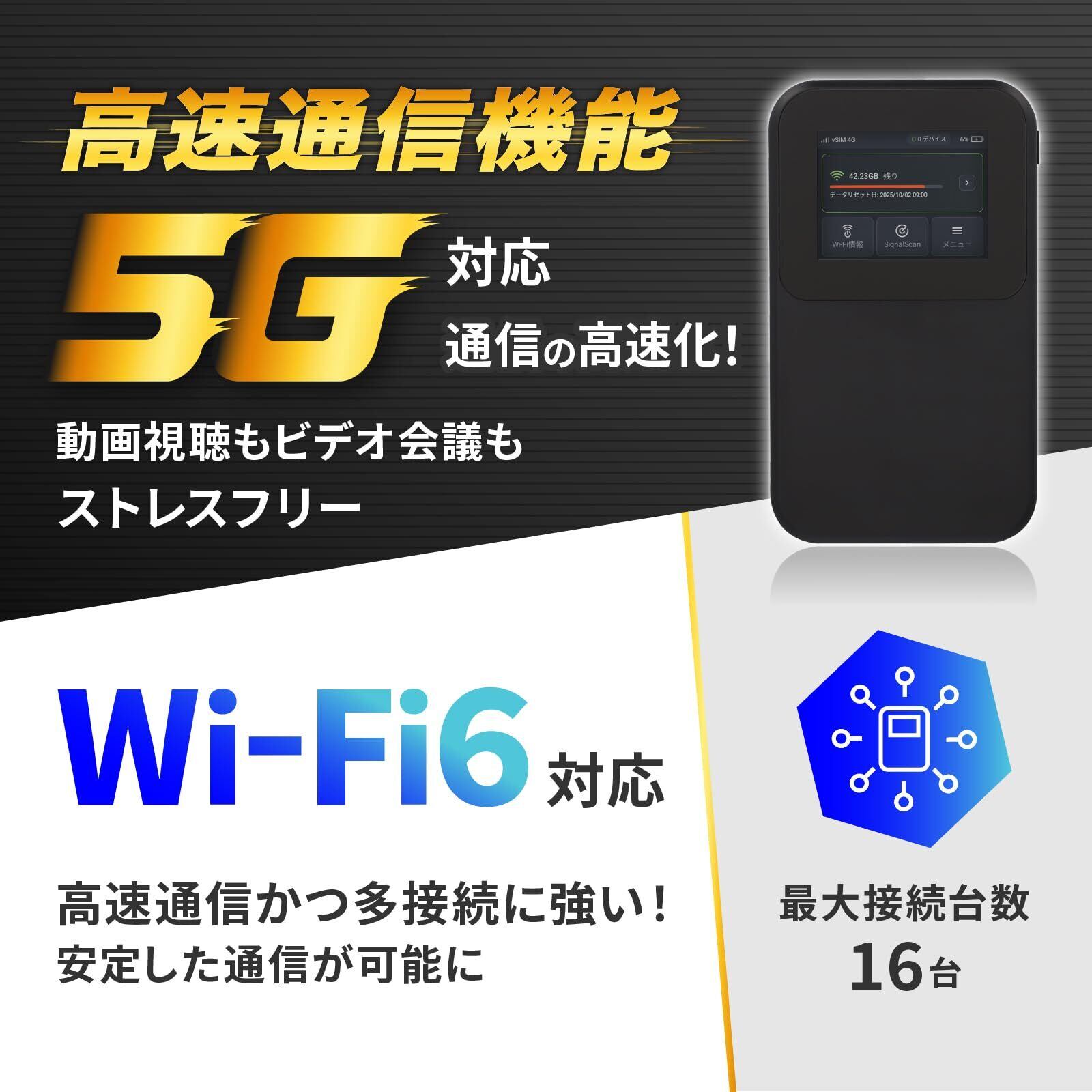特徴 5Gルーター端末。高速安定通信/WiFi6対応、国内・海外両用。同時接続台数16台