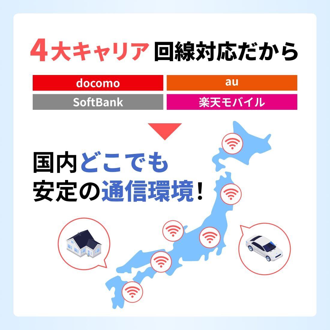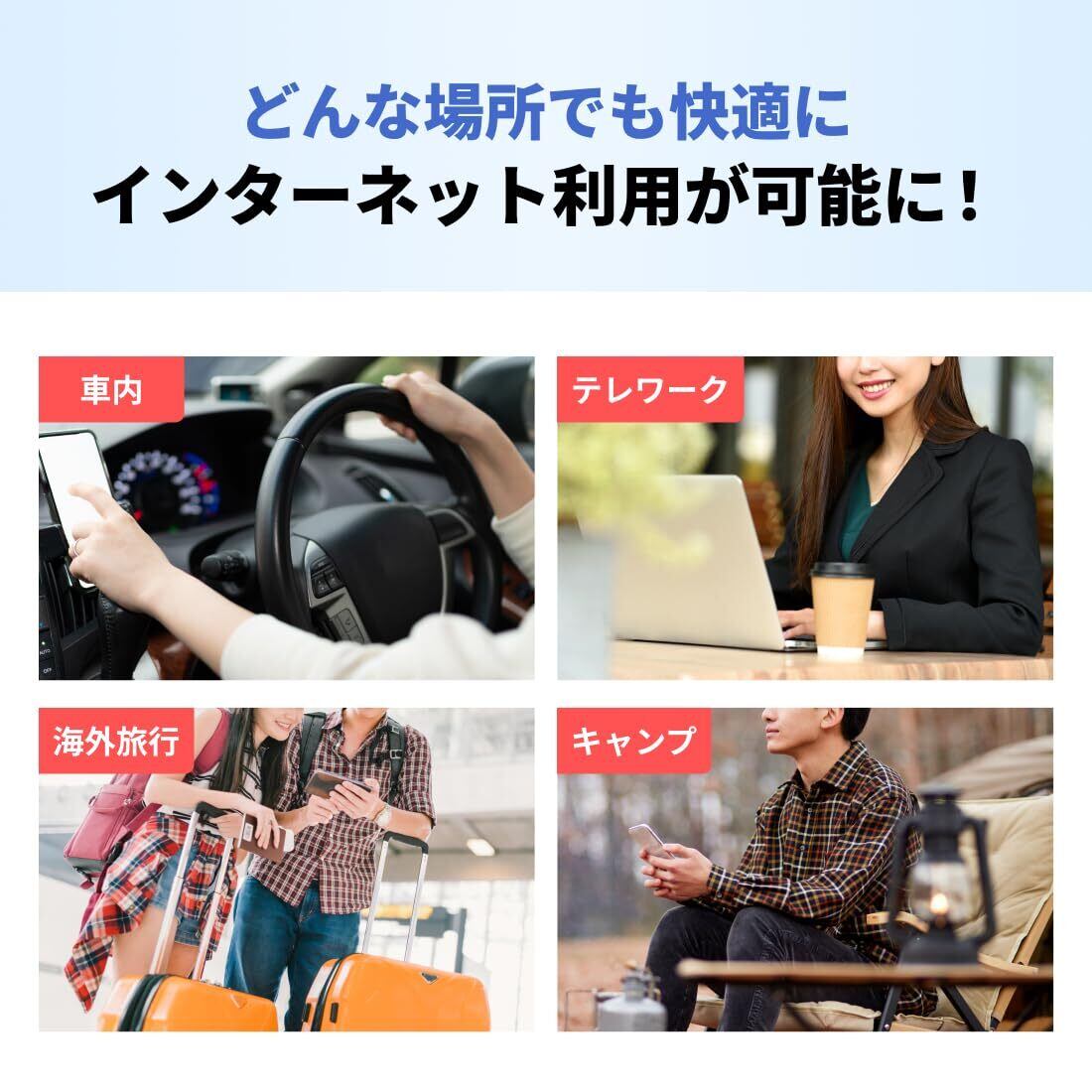 利用シーンはさまざま。国内外どこでも利用できます 車で利用(ドライブ、車中泊)、郊外で利用(旅行、キャンプ)ビジネスで利用(国内外の出張、出先でのテレワーク)、家族で利用(引越し時、家族共有のサブ回線、お子様のタブレット学習用)入院などの急な用途にもオススメです ※海外利用には、リチャージ専用サイトから海外用チャージの購入が必要です