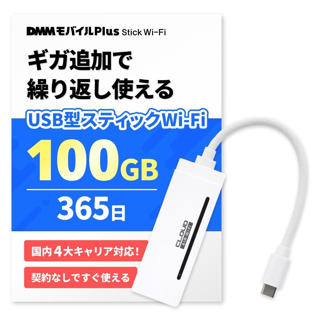 【DMMモバイル Plus Stick Wi-Fi】スティック型 wifi 100GBチャージ済・365日間 モバイル USB型 リチャージ可能 モバイルルーター (100GB)