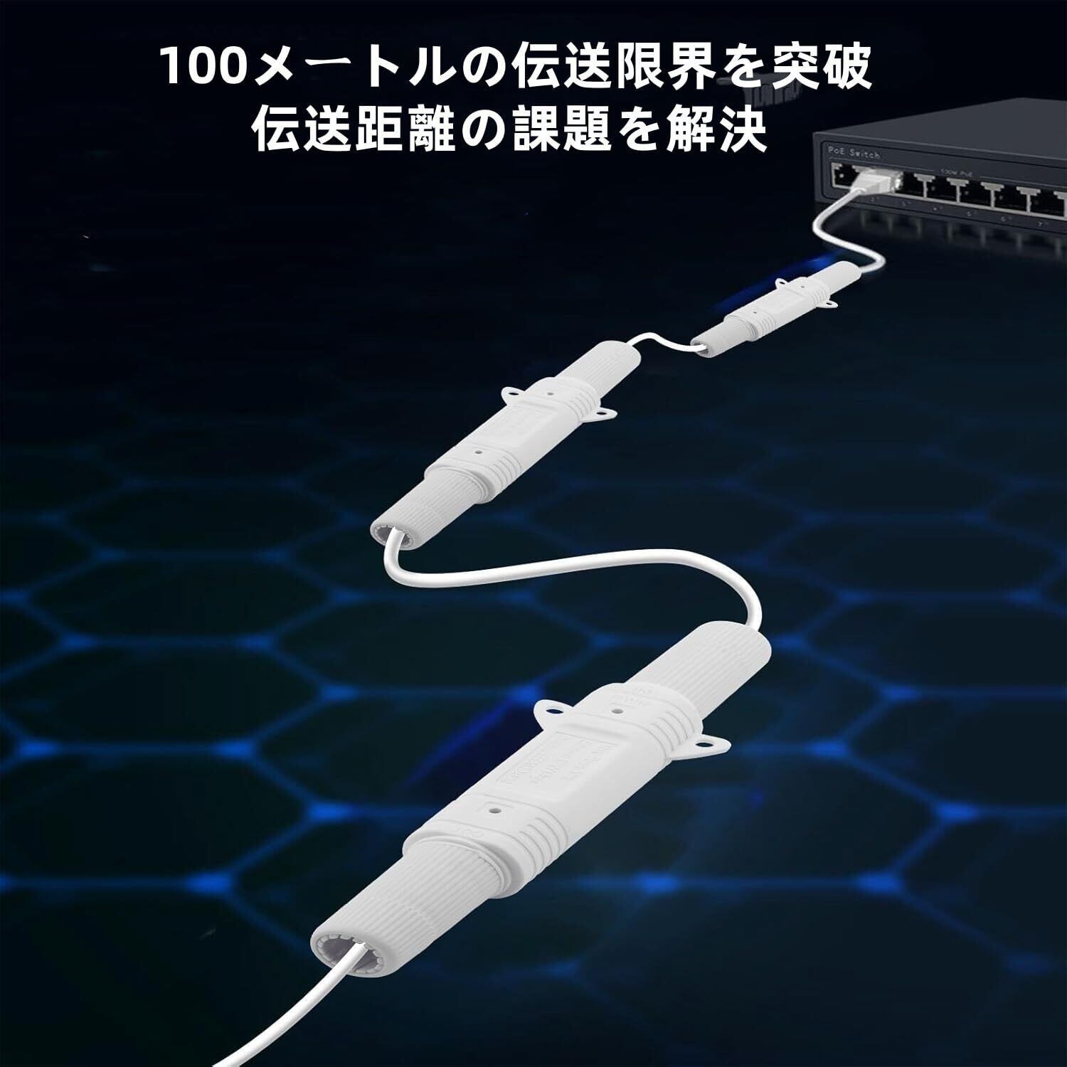「このエクステンダーは、10/100Mbpsのデータ伝送が可能で、最大100メートルの距離まで、安定した信号を確保します。監視カメラやワイヤレスデバイスなど、通信距離の長い設置に最適です。」