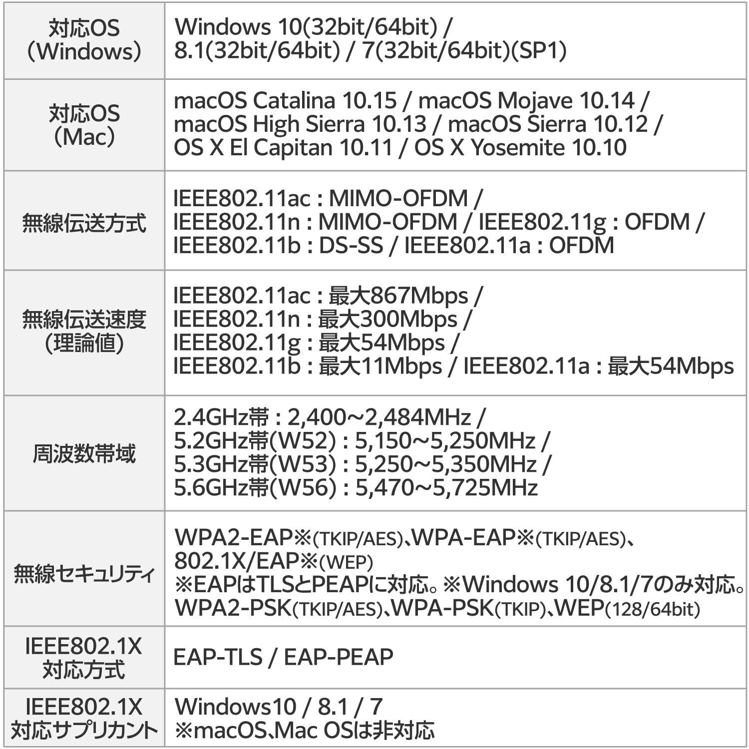 ■無線セキュリティ:WPA2-EAP※(TKIP/AES)、WPA-EAP※(TKIP/AES)、 802.1X/EAP※(WEP) ※EAPはTLSとPEAPに対応しています。 ※Windows 10/8.1/7のみ対応です。 WPA2-PSK(TKIP/AES)、WPA-PSK(TKIP)、WEP(128/64bit)