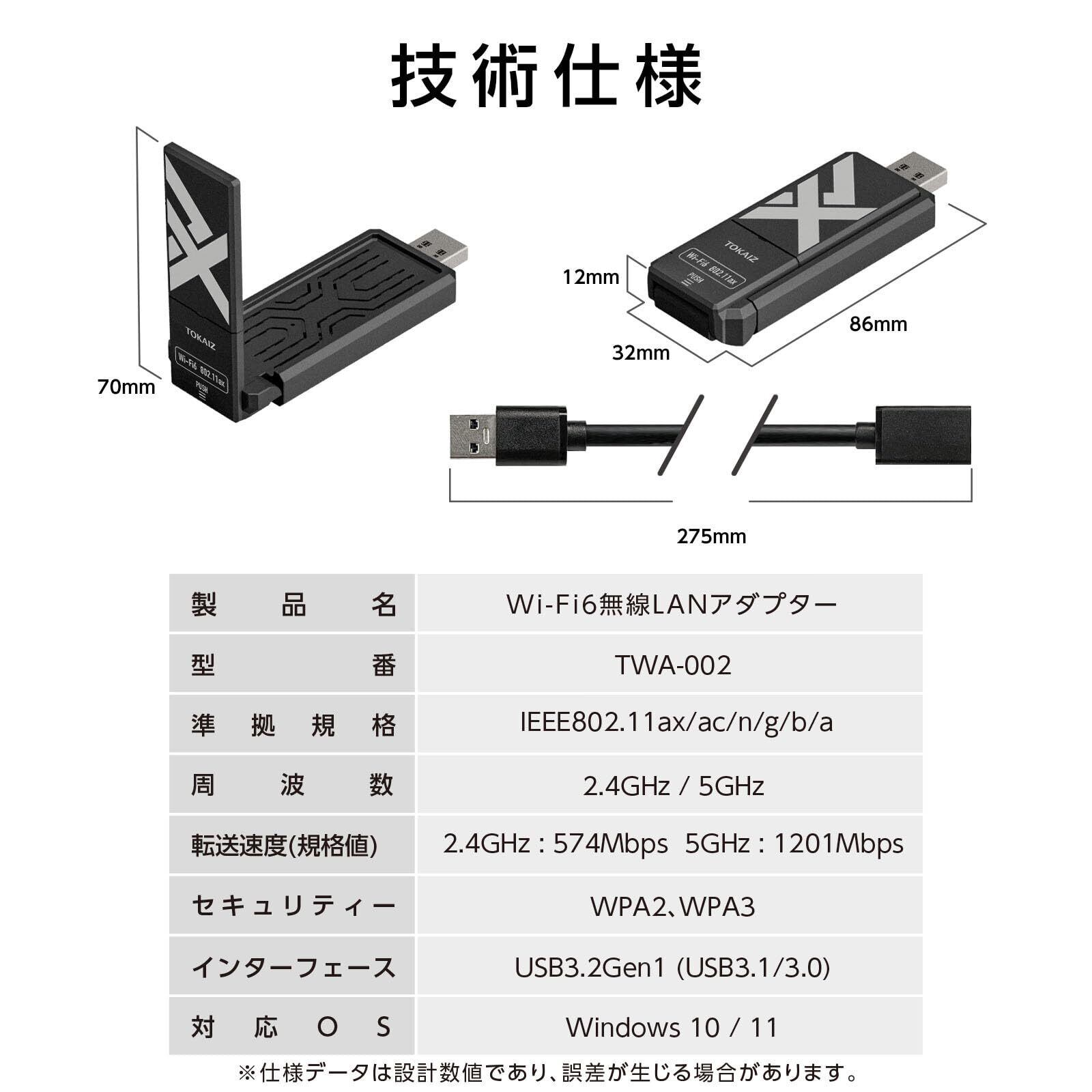- 本商品はUSB3.2ポートに接続してご使用してください。USB2.0では十分な速度が得られない可能性があります。TOKAIZの無線LAN子機が、あなたのインターネット環境をさらに向上させることを期待しております!