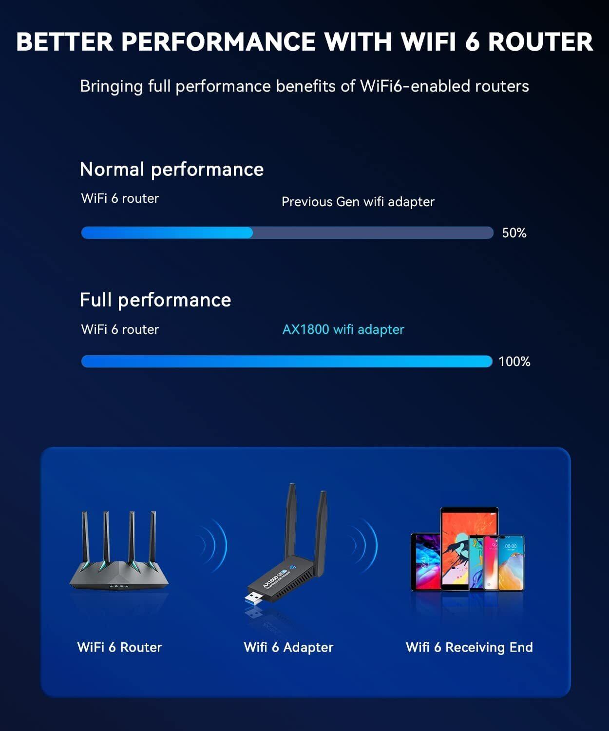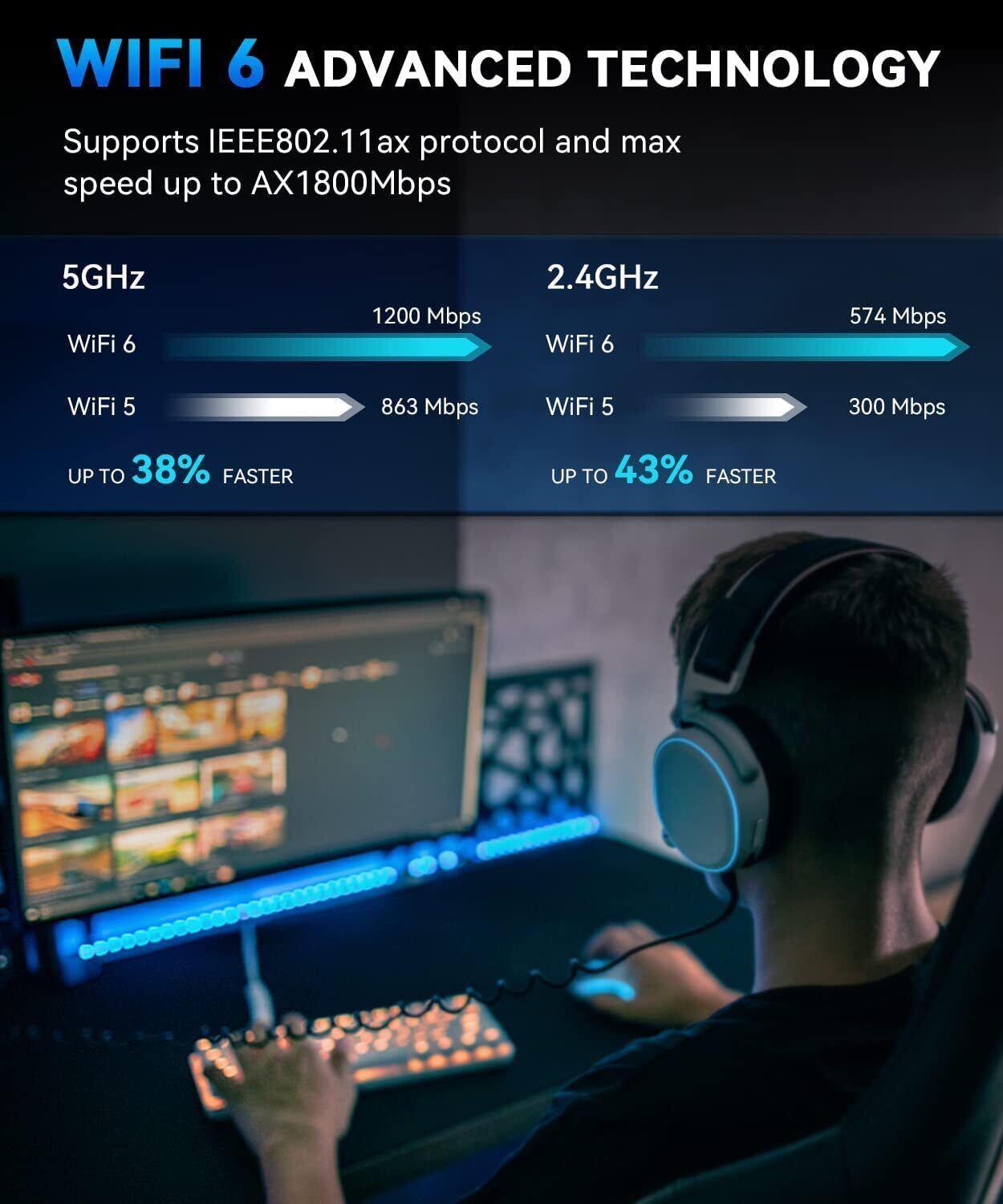 進化したWIFI 6のスピード。AX1800 Wifi 6 は現在の WiFi 5 の速度より 5GHz (1200Mbps)および 2.4GHz (600Mbps)で 43% 速く最高速度を提供します; 親切なノート理論速度に達するために WIFI 6 ルーターを持っている必要があります