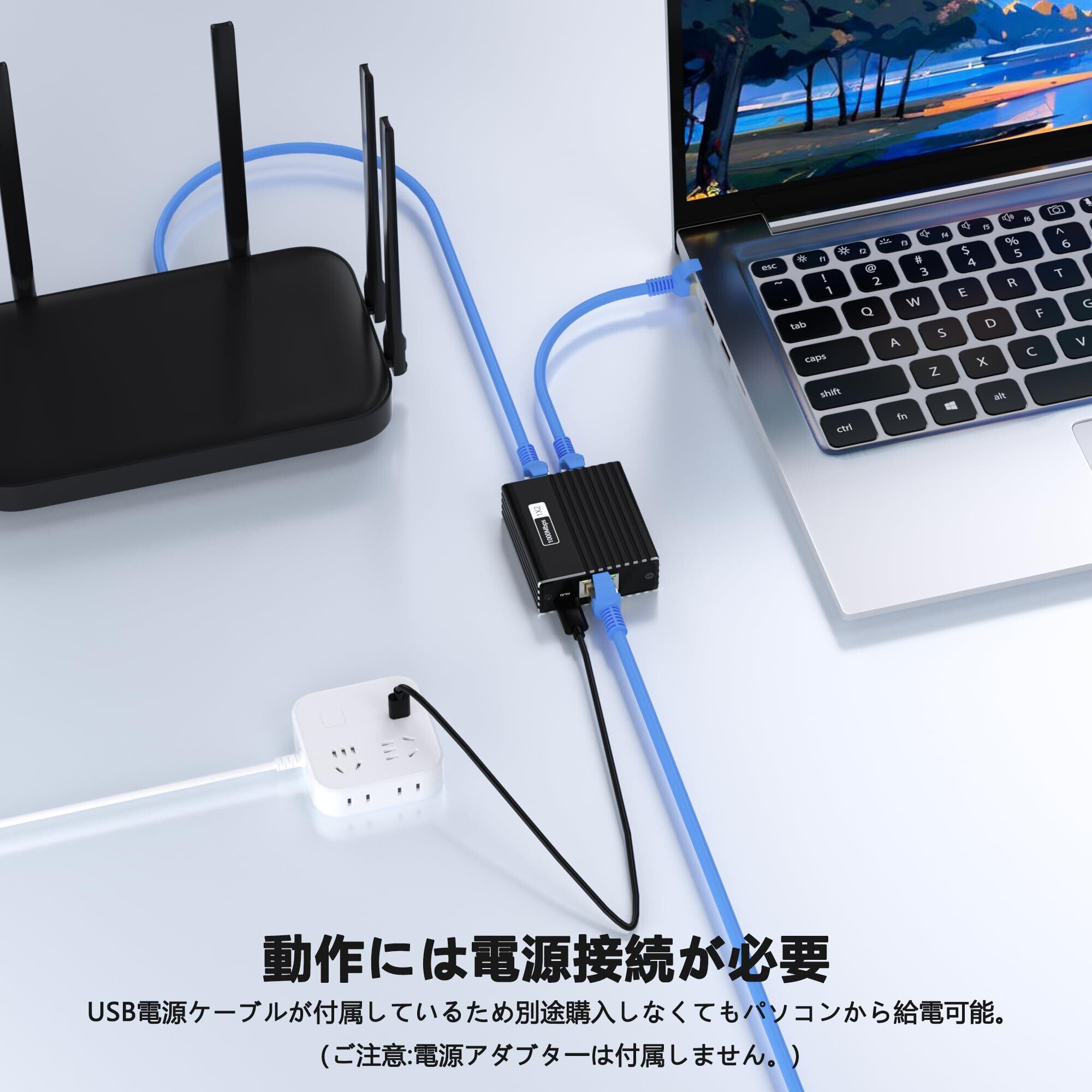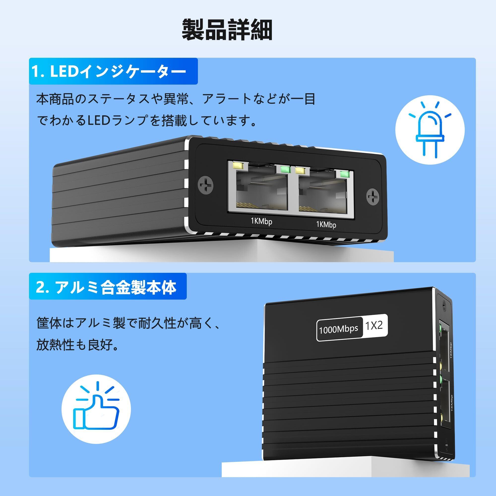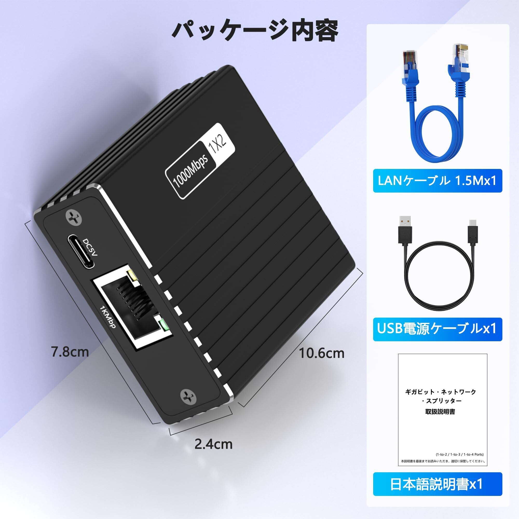 【アルミ合金製本体】LAN ケーブル 分配器本体ケースは安物なプラスチック製ではなくて、アルミ合金製でどっしりとして高級感があり良い作り商品です、散熱性や耐久性はプラスチック製より一層増やせます。メタルケースは内部精密部品をダメージから保護し、放熱性を高め、よりハイパフォーマンスを発揮できます。 また、USB給電口が付属しており付属品としてUSBケーブルも同梱されています。