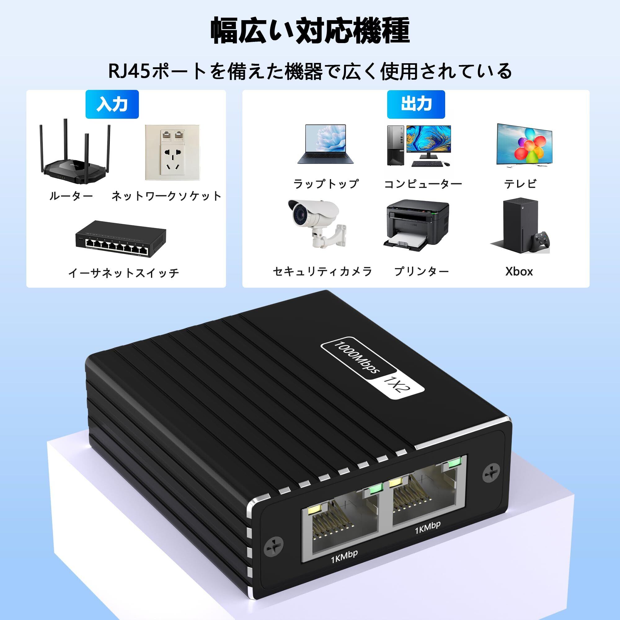 「このスイッチングハブは、1つのLANポートから2つの出力ポートを提供し、同時に複数のデバイスを接続できます。家庭用のPCやゲーム機、オフィスの設備など、様々なシーンで活躍します。Inclusivoな設計により、幅広い機器に対応できるところが魅力です。」
