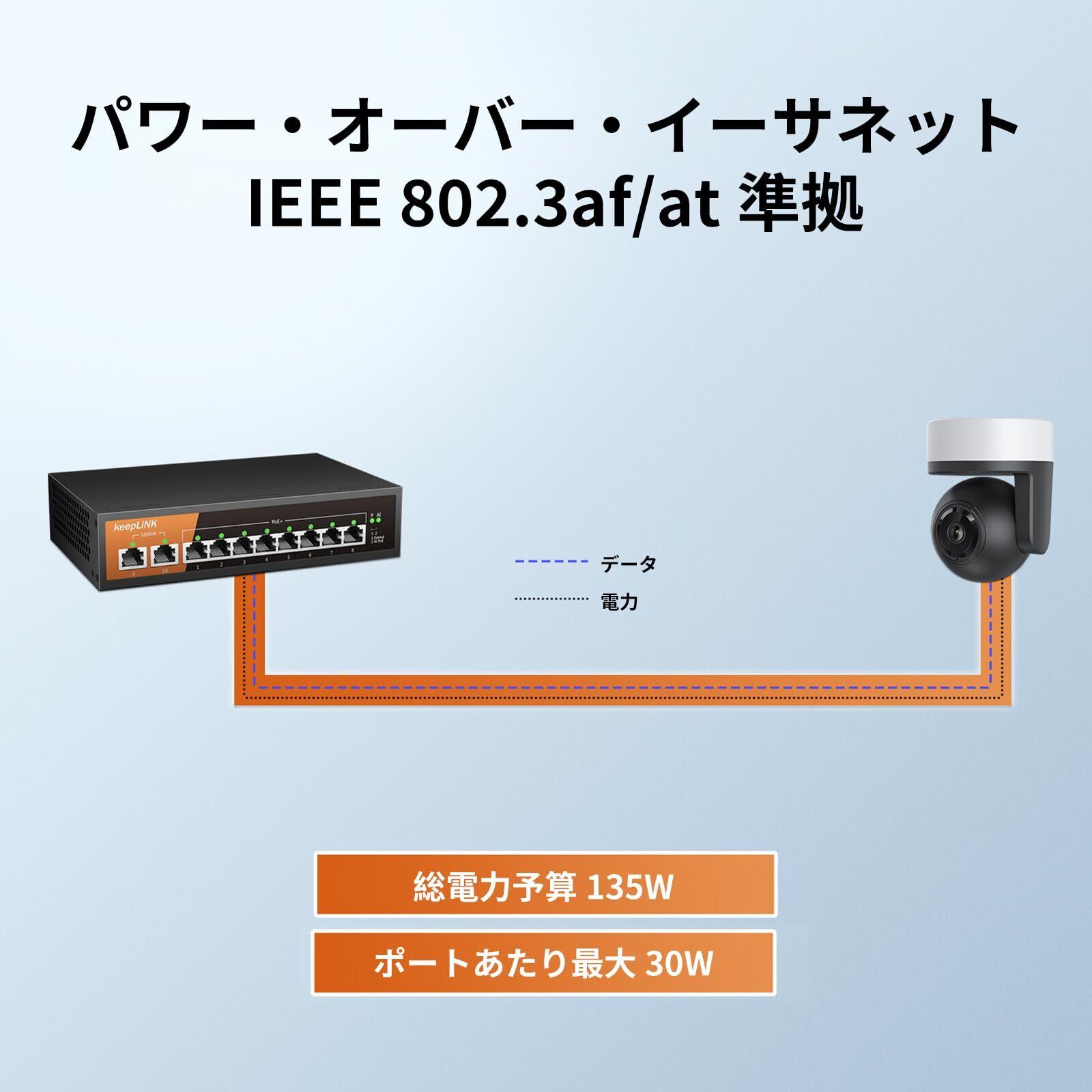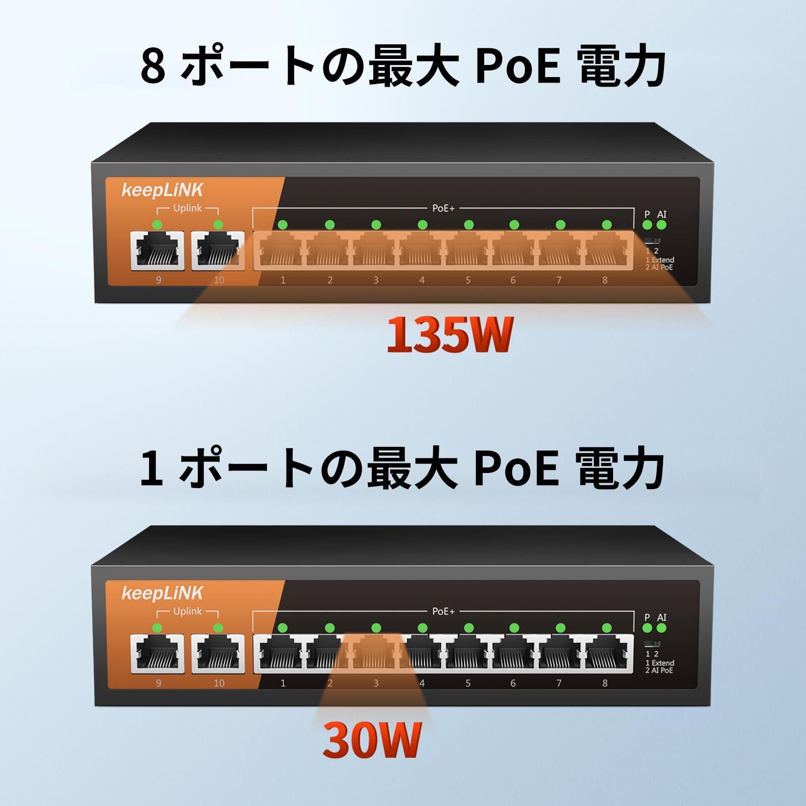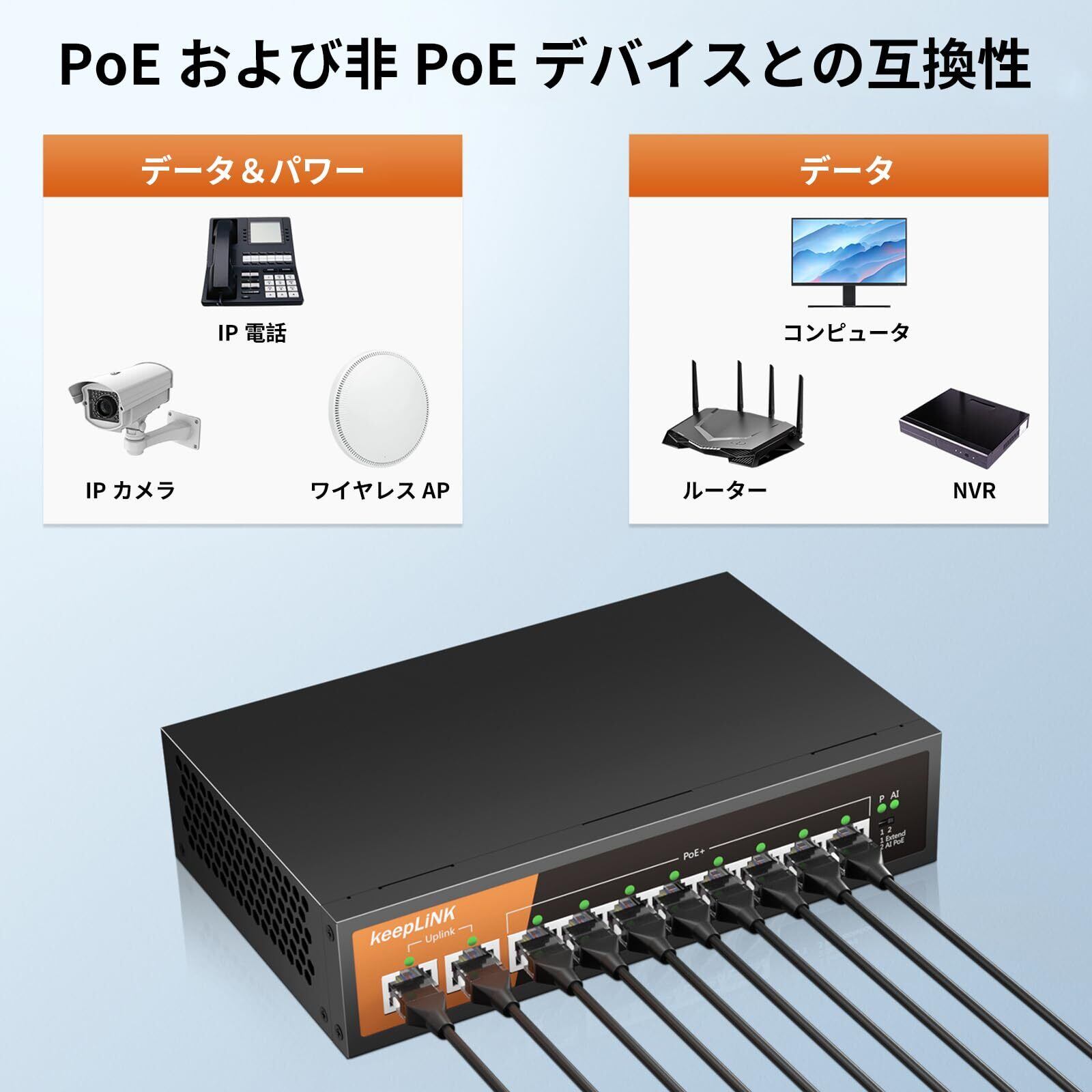 「このスイッチングハブは8つのPoE+ポートを装備し、IPカメラや無線LANアクセスポイントなど、様々なデバイスに電力とデータを同時に供給します。複数の機器を簡単に接続でき、効率的なネットワーク環境を確保します。」