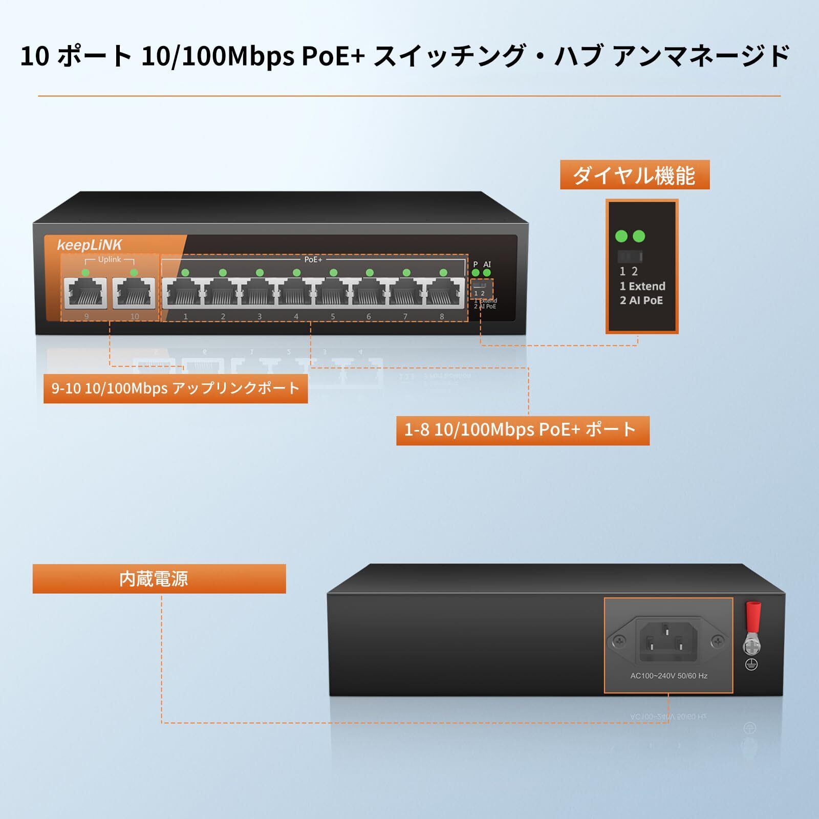 10ポート PoE スイッチングハブ 10/100Mbps (8ポートPoE+ 120W) 静音ファンレス 金属筐体 省電力設計