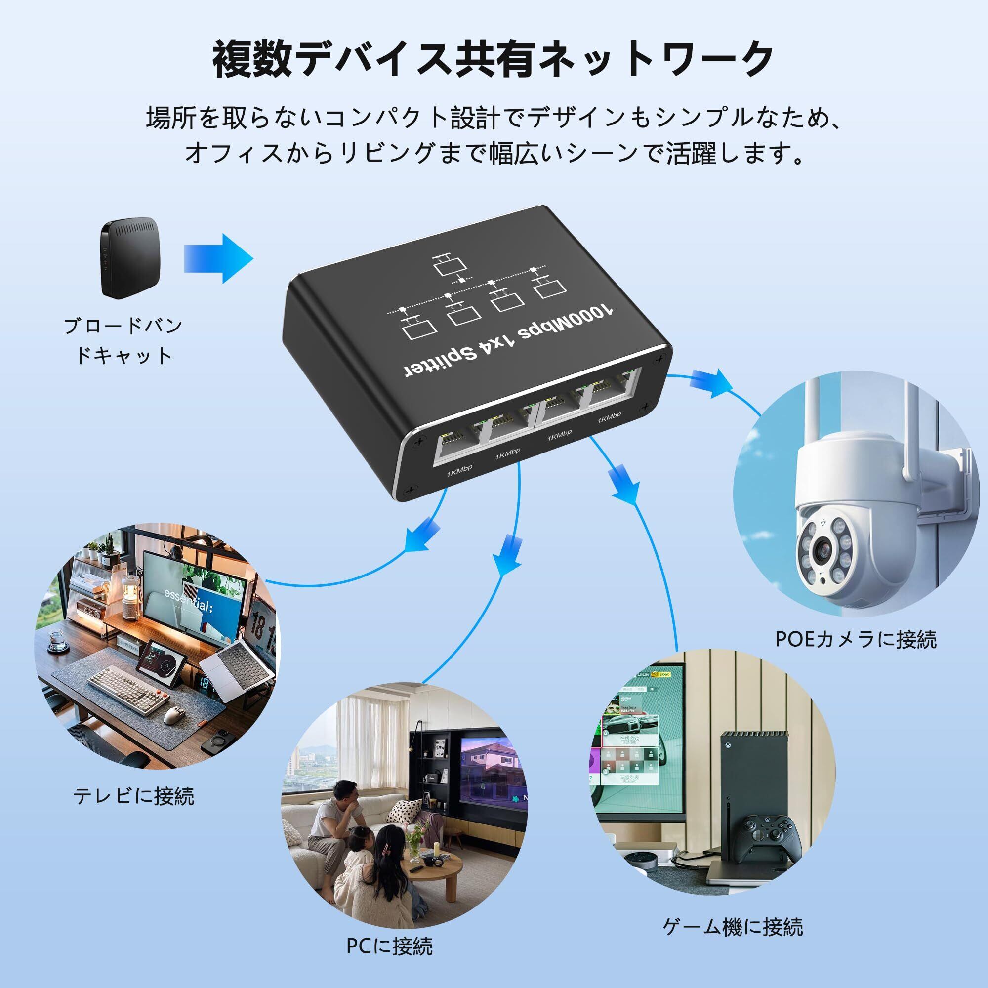 「このスイッチングハブは4つの出力ポートを搭載しており、複数のデバイスを同時に接続できます。ゲーム機やパソコン、プリンターなど、様々な機器を効率良くつなげ、快適なネットワーク体験を提供します。」