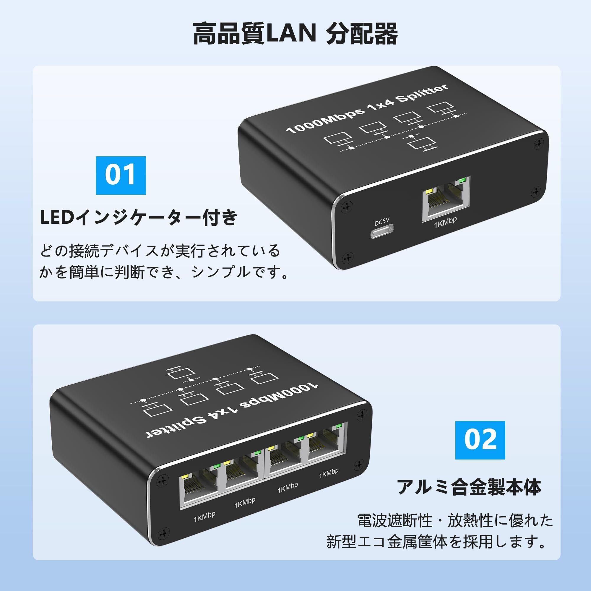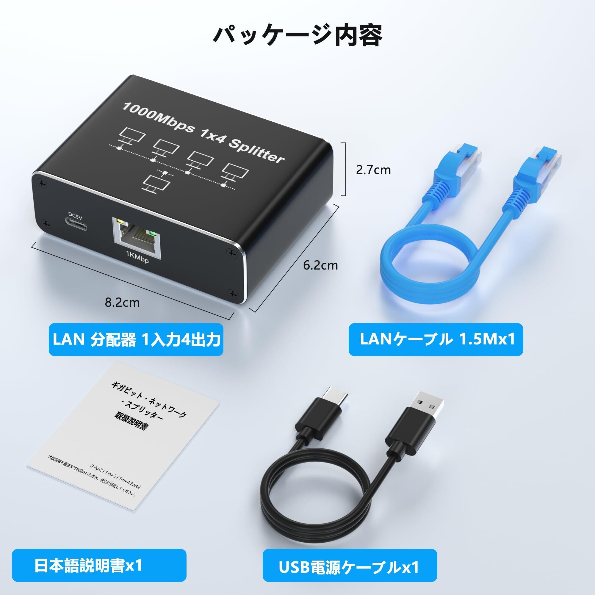 【放熱性の高いアルミニウム合金筐体を採用】耐久性と放熱性に優れた金属製の筐体を使用。場所を取らないコンパクト設計でデザインもシンプルなため、オフィスからリビングまで幅広いシーンで活躍します。また、ファンレス設計を採用しており、静かなオフィスで動作音を気にせずに使えるのも便利です。【パッケージ内容】1xLAN 分配器、1xCat6 LANケーブル(1.5m)、1xUSB Type-C電源ケーブル、1x日本語取扱説明書。