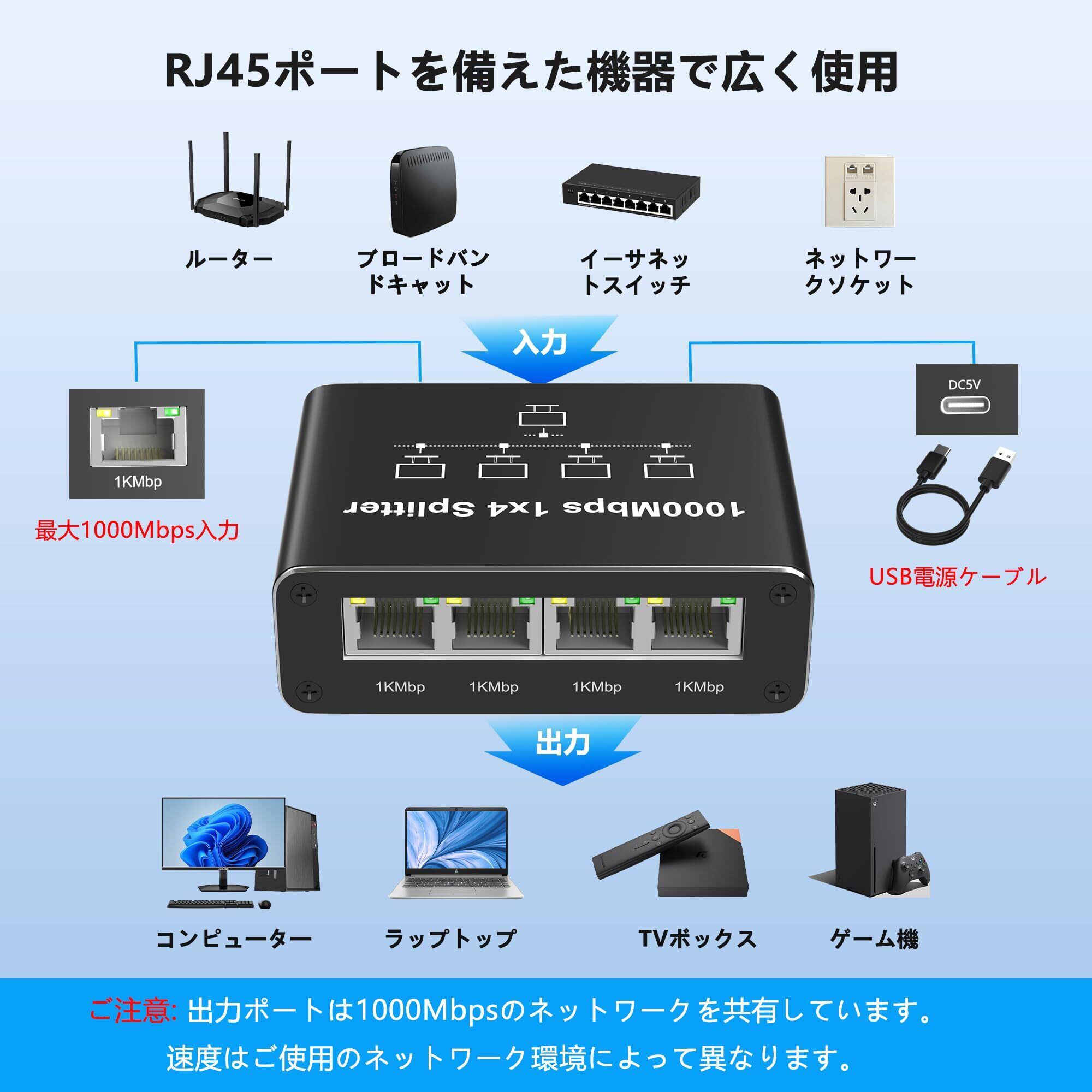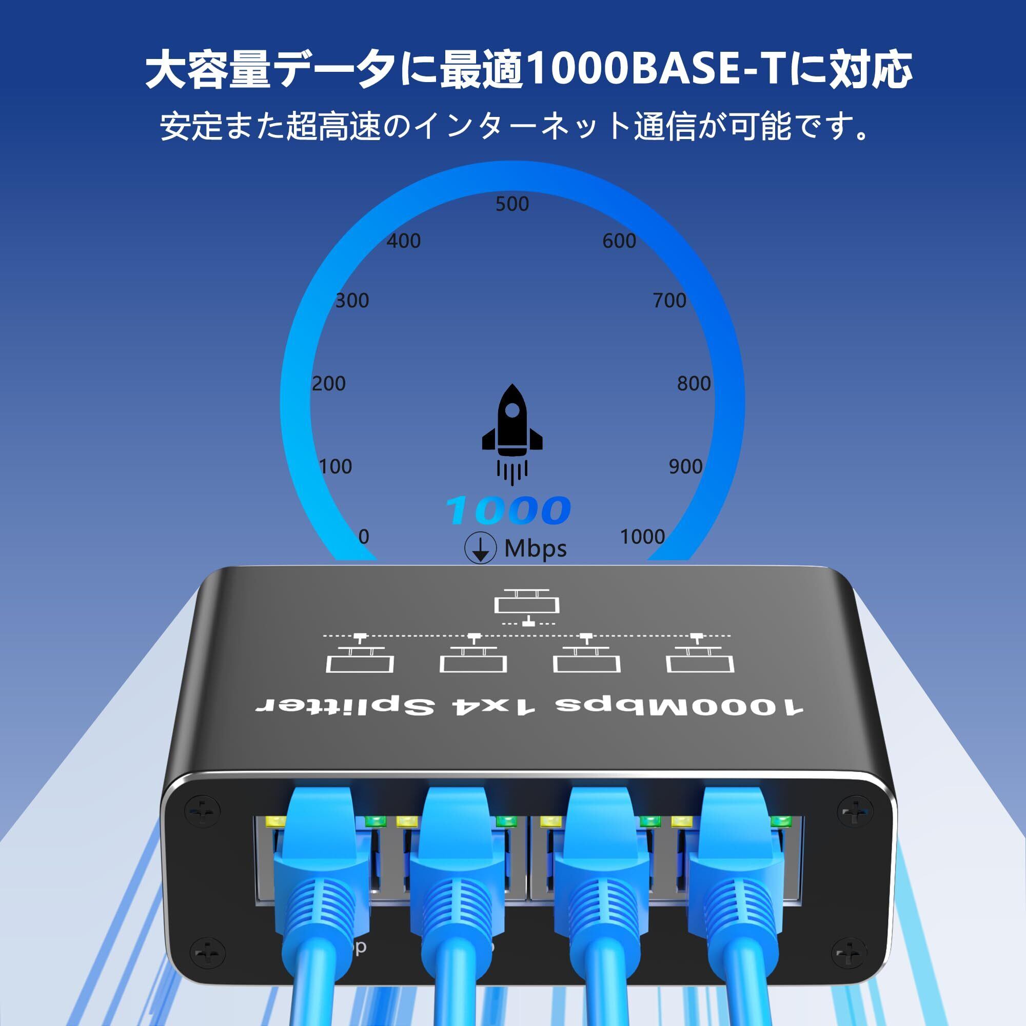 「『スイッチングハブ LAN 分配器 1入力4出力』は、1つの入力ポートから4つの出力ポートに接続できる便利なネットワーク拡張デバイスです。最大1000Mbpsの高速通信に対応しており、家庭やオフィスのネットワーク環境を補完する理想的な製品です。付属の1.5mランケーブルで、すぐに使い始められます。」
