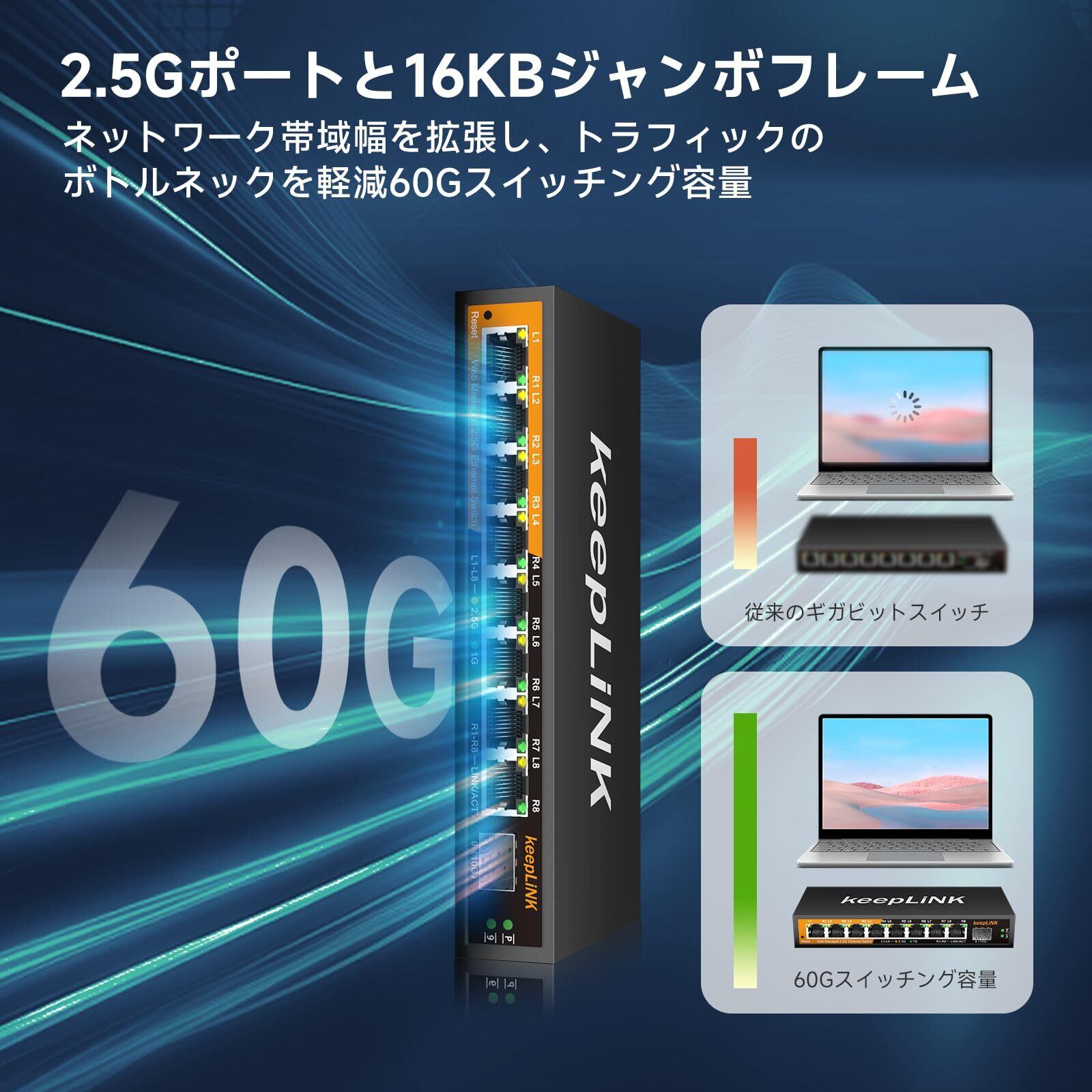 【2.5Gスイッチ】: 9XHML-X 2.5Gスイッチは、IEEE802.3bz (2.5G)規格に準拠した2.5GBASE-Tイーサネットポートを8ポート搭載し、10/100/1000M/2.5Gに対応します。1 x 10G SFPポート(互換性のある1G/2.5Gモジュール、SFPモジュールは含まれません)。60Gbpsのスイッチング容量、優れたデータ転送性能。