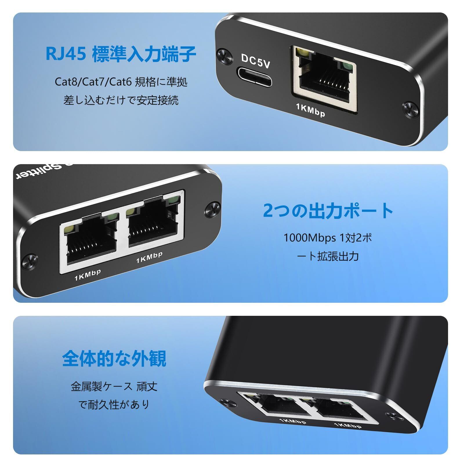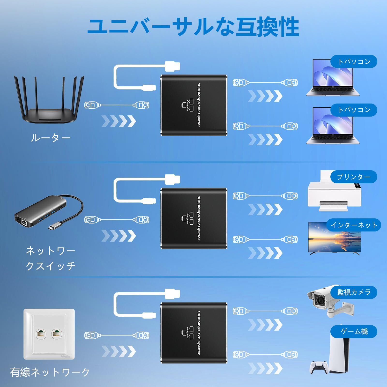 【Cat8、Cat7、Cat6規格対応】高耐久性金属筐体、環境配慮型PCB基板と金メッキ導体設計を採用。長期使用に耐え、信号が安定し、LAN分配器として省エネで信頼性が高い。シンプルで軽量、持ち運びに便利で耐久性があります。この RJ45 ハブは Cat8、Cat7、Cat6 ネットワークケーブルおよび多様なデバイスと互換性があり、ルーターやテレビボックスなどの旧式デバイスと併用可能。クロストークを低減し、全体的な機能性を向上させます