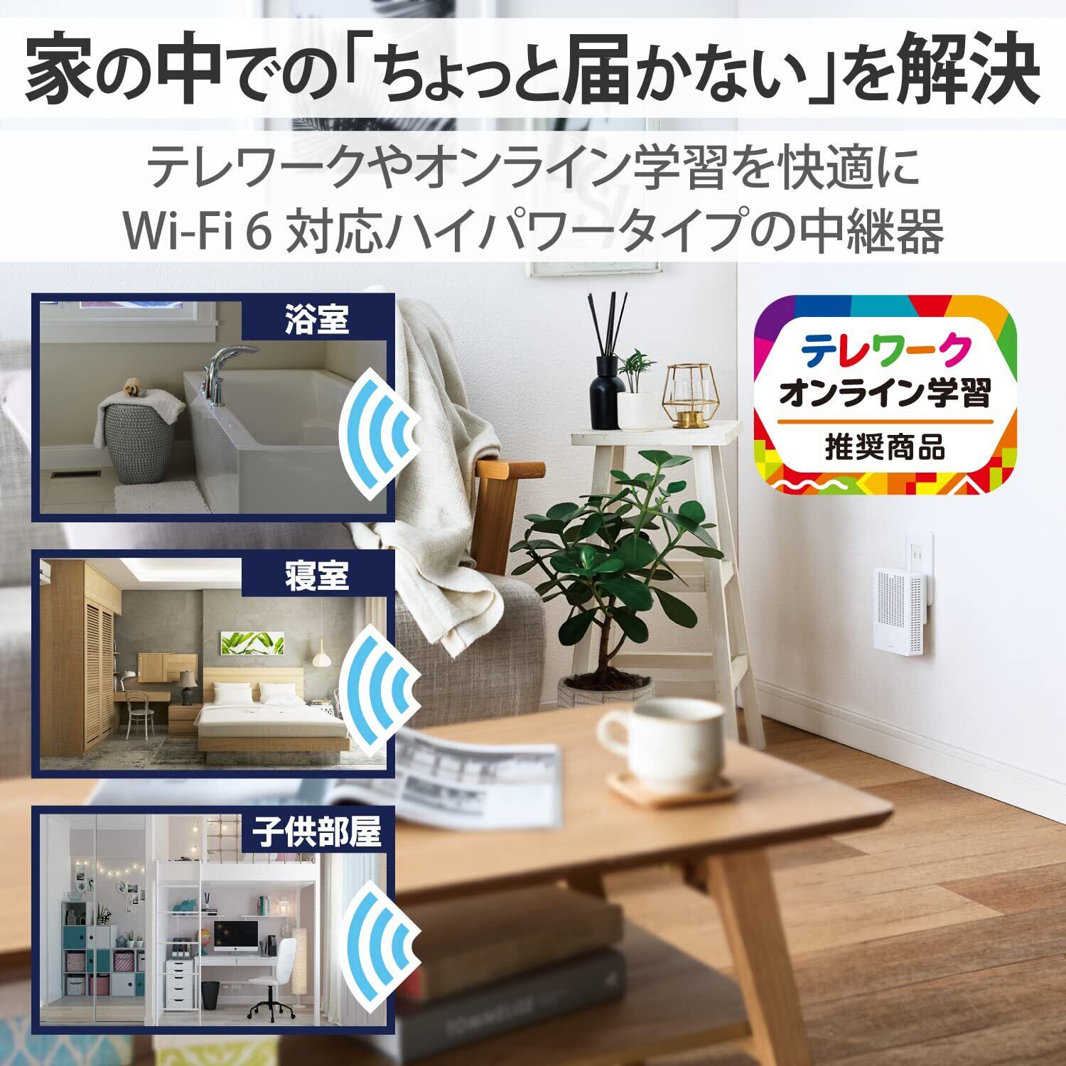 「この中継器は、最新のWi-Fi 6(11ax)規格に対応しており、家庭内の複数デバイスの同時接続を可能にします。大容量データ転送やストリーミングもスムーズに行えるため、家族みんなで快適に楽しむことができます。」