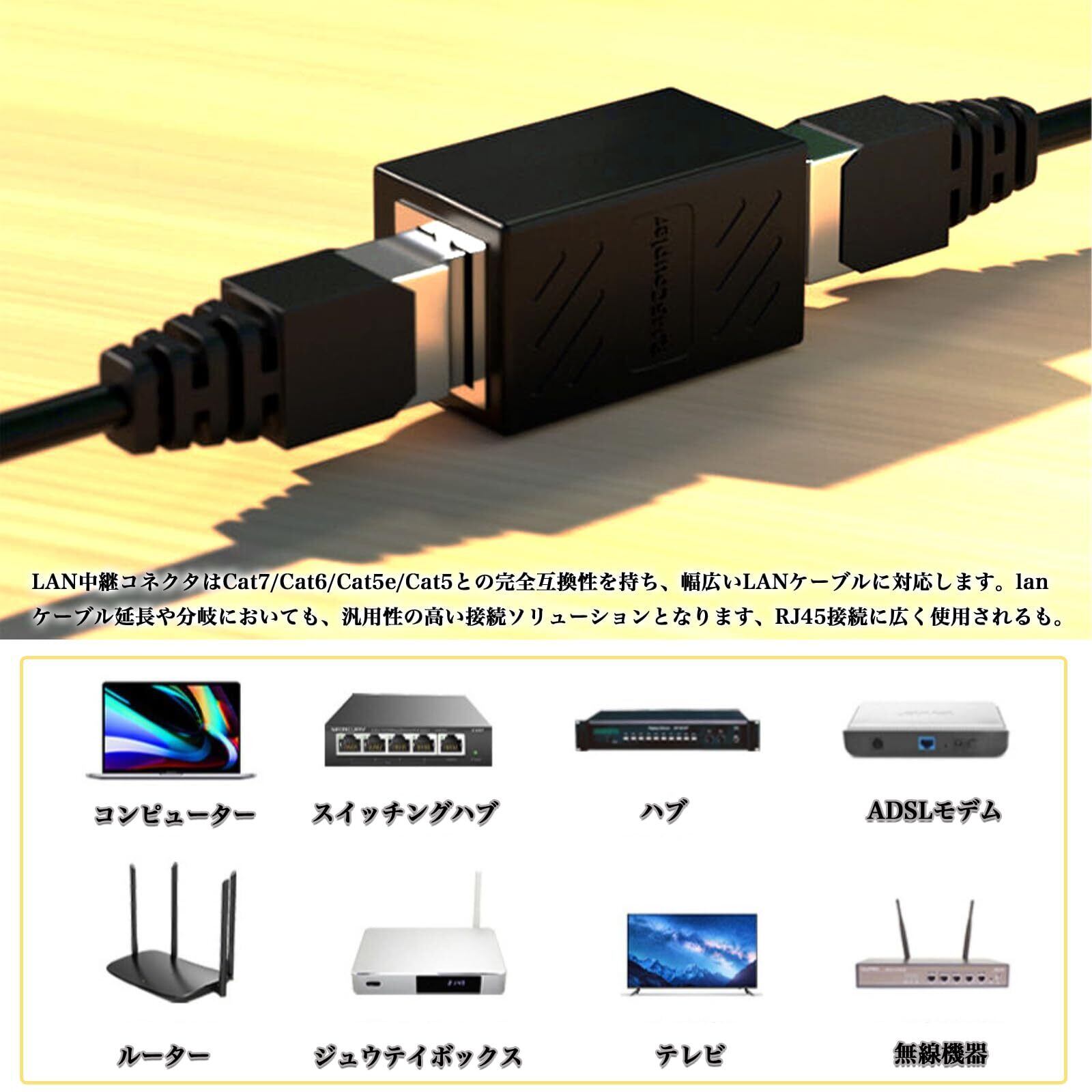 【ユニバーサル互換性】LAN中継コネクタはCat7/Cat6/Cat5e/Cat5との完全互換性を持ち、幅広いLANケーブルに対応します。lanケーブル延長や分岐においても、汎用性の高い接続ソリューションとなります、RJ45接続に広く使用されるものコンピューター、スイッチングハブ、ハブ、ADSLモデム、ルーター、デジタルセットトップボックス、テレビ、無線機器。
