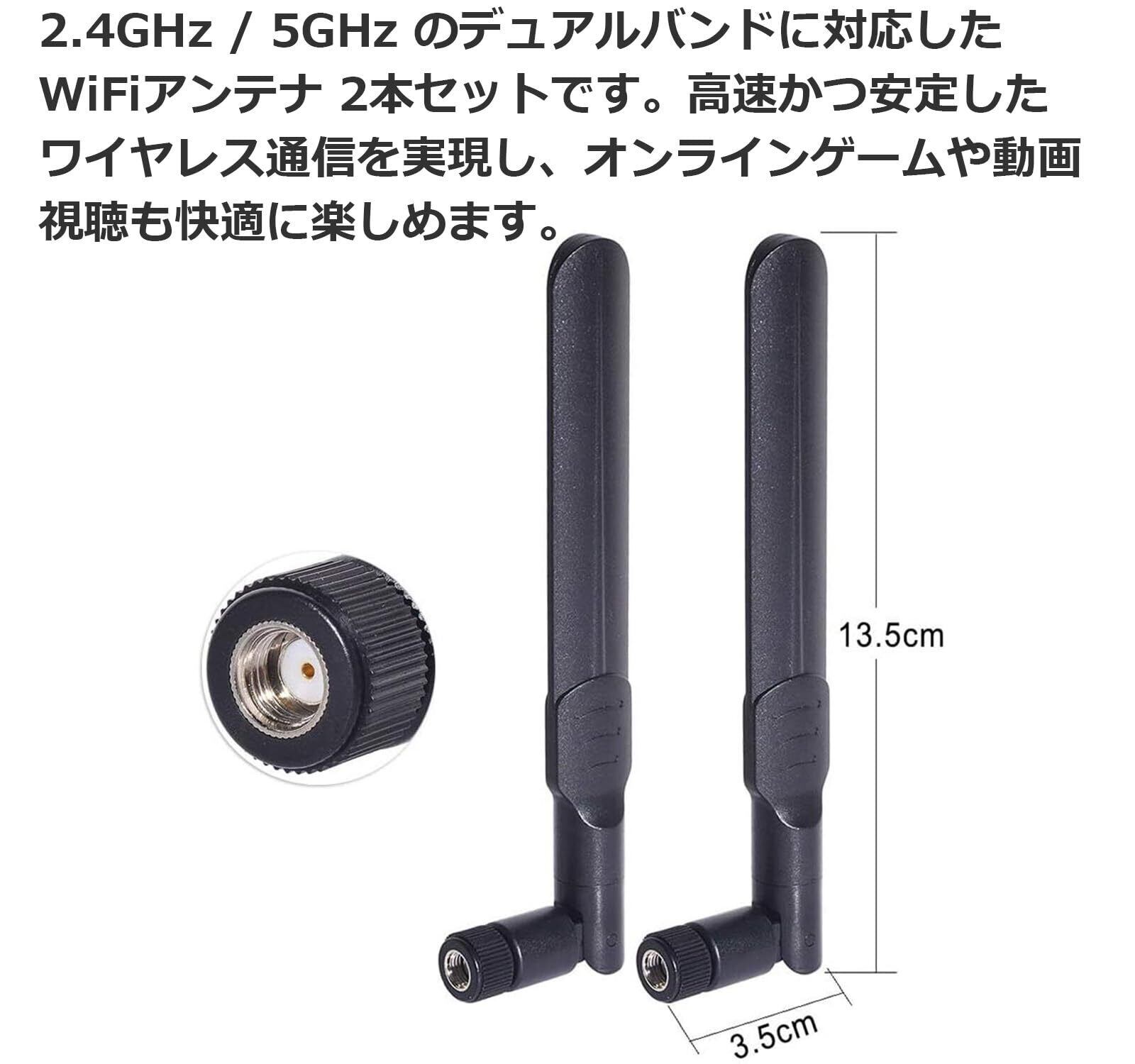 2.4GHz、 5GHz/5.8GHz のデュアルバンドWiFiに対応したワイヤレス WiFiアンテナ 2本セットです。高速かつ安定したワイヤレス通信を実現し、オンラインゲームや動画視聴も快適に楽しめます。