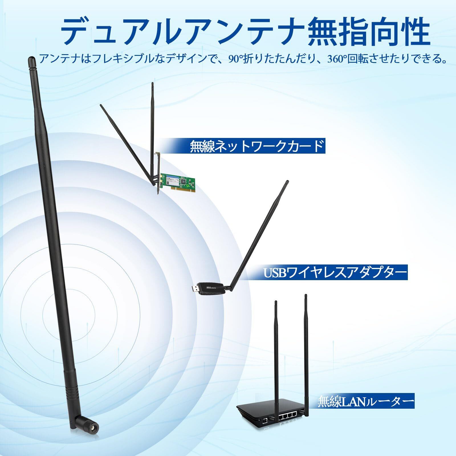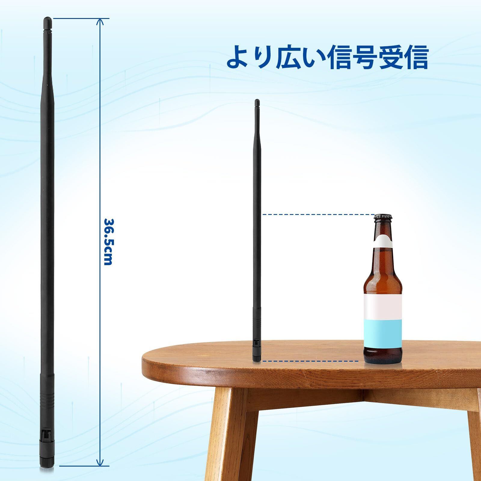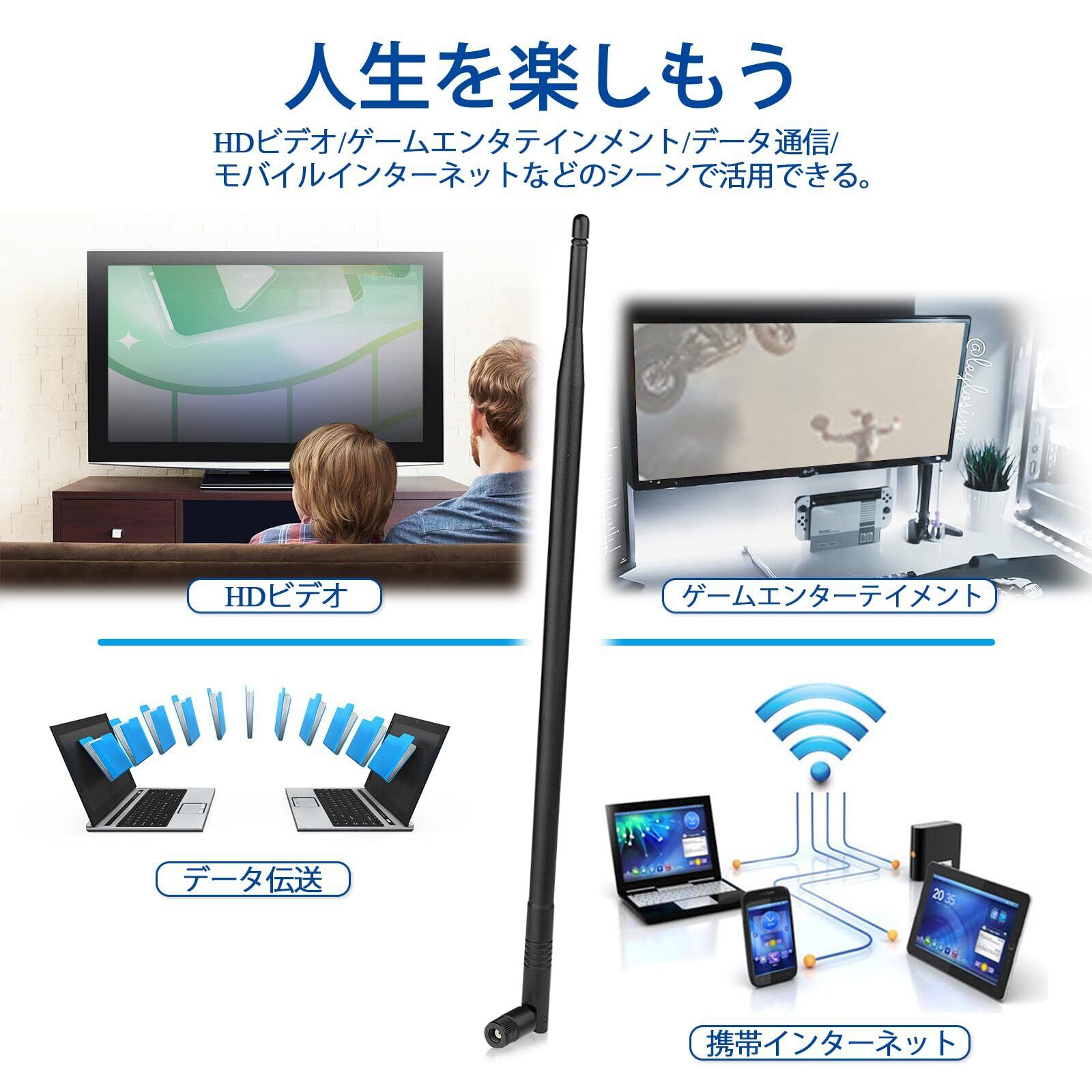 「高利得8dBi設計によるこのアンテナは、信号強度を大幅に向上させます。2.4GHzおよび5GHzの周波数帯域に対応し、さまざまなデバイスと高い接続性を持つため、快適なネットワークを提供します。」
