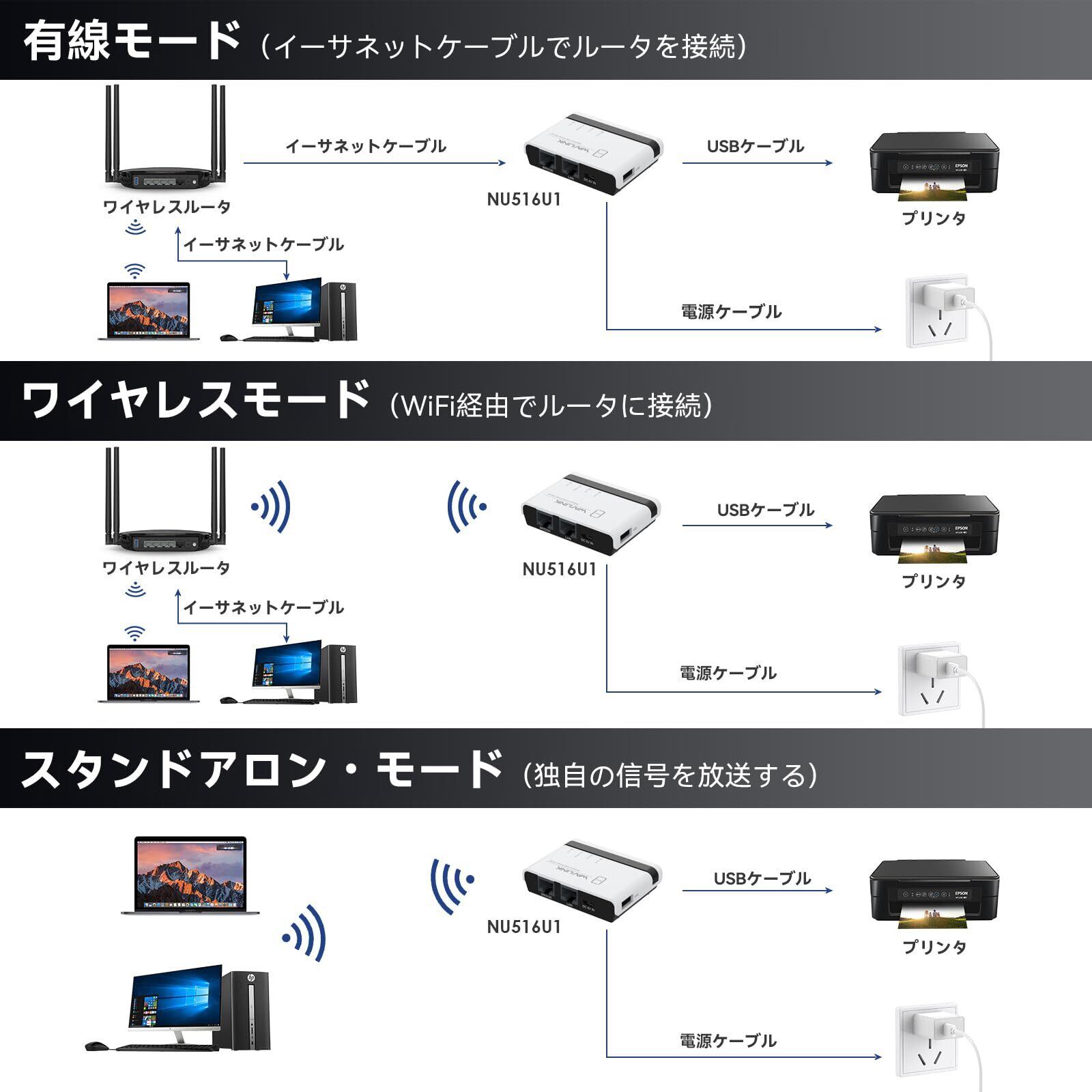 「本製品はスタンドアロンモード対応で、セットアップも簡単!USB接続により、既存のプリンタをワイヤレス環境で使用することができ、デスク周りをすっきりと整えることができます。プリンタをWi-Fi経由で複数のデバイスから簡単にアクセス可能!(無線LAN環境が必要です)」