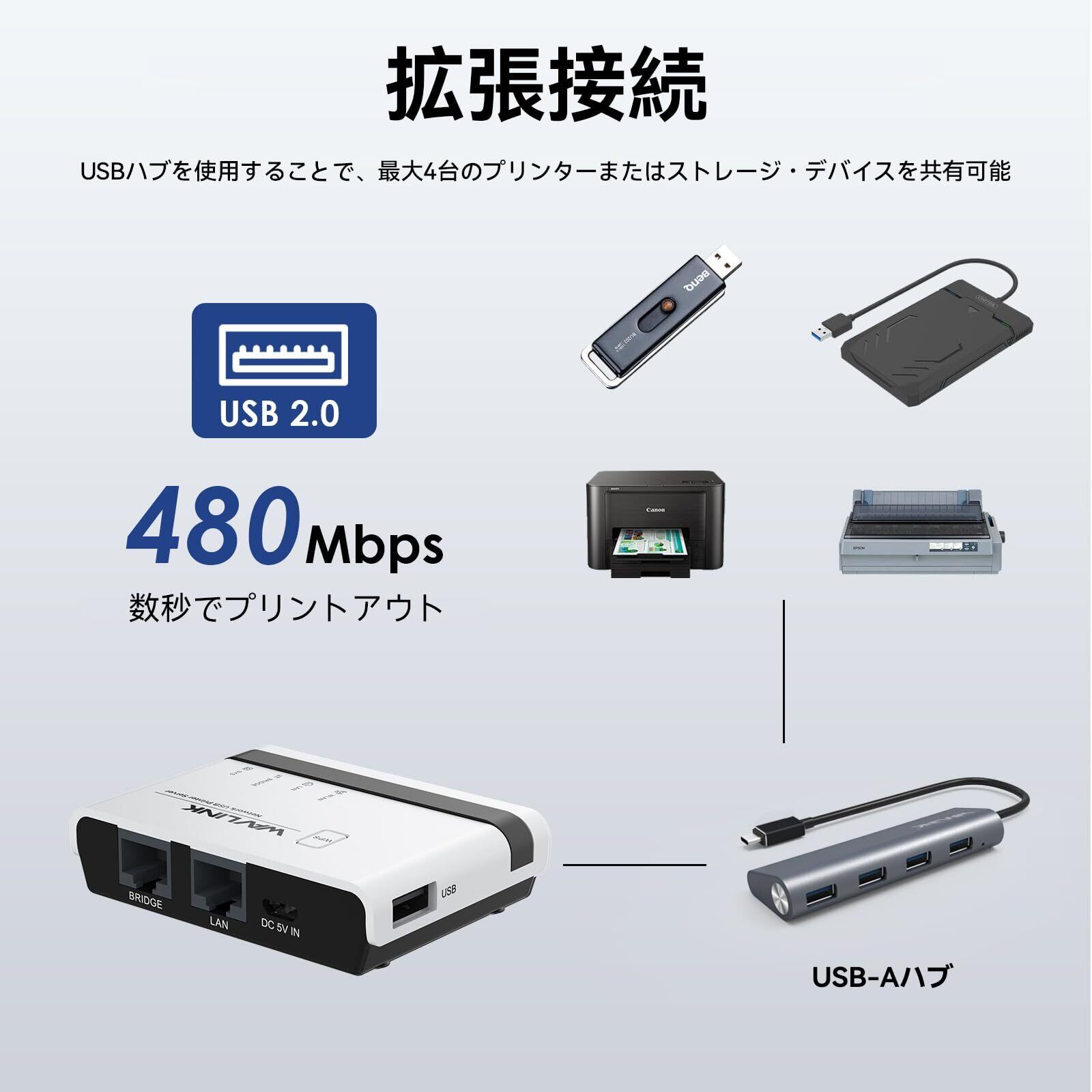 WAVLINK WiFi USB2.0プリントサーバは、家庭やオフィスでプリンタをワイヤレスで共有できます。 WAVLINK wifiプリントサーバでは、複数のユーザと異なる方法でusbプリンタを共有できます。有線/無線モードでは、製品はネットワーク線/wifi信号を介して上位ルータに接続されています。スタンドアロンモードでは、この製品はwifi信号をブロードキャストし、コンピュータはこの信号に接続することでプリンタを共有することもできます。usb 2.0準拠しており、usbハブを介して4台のプリンタまたはストレージデバイスを接続することができます。手のひらサイズと広範な互換性により、プリントサーバは家庭、倉庫、店舗、オフィス、電子商取引、ソーホー、政府、教育機関、その他の印刷機能を共有する必要がある場所に適しています。 インストール手順 ①.電源アダプタを接続します。 ②.プリンタとネットワークを接続します。 ③.【クイックスタートガイド】に従ってコンピュータ上のプリンタとネットワーク設定を構成してください。 プリンタとネットワーク設定手順の詳細については、『クイックスタートガイド』を参照してください。 LEDインジケータの説明 WLAN LEDオン/オフ----WiFiがアクティブ/非アクティブになっている LAN LEDの点灯/消灯----LANポートの接続/切断 BRIDGE LEDの点灯/消灯----BRIDGEポートの接続/切断 SYS LEDの点灯/ゆっくり点滅-----プリンタサーバがルータに接続されている/接続されていない。 SYS LED高速点滅----WPSオン 幅広い互換性 このUSB2.0ワイヤレスプリントサーバは、HP、キヤノン、エプソン、Brother、シャープ、富士ゼロックス、レノボ、Aurora、サムスン、コニカミノルタ、デリー、東芝、京セラ、シマウマ、OKIなど、RAWプロトコルを対応する他のプリンタなど、ほとんどのUSBプリンタに適しています。Canon LBP 2900、2900+、3000、7200、HP P 1108、HP M 403 D、Epson 1390などのプリンタはサポートされていません。プリンタがRAWプロトコルに対応しているかどうかわからない場合は、確認のためにカスタマーサービスにお問い合わせください。 WPSとリセットボタン WPS機能を備え、パスワードを入力することなく簡単にワイヤレスネットワークに接続できます。無線中継器モードでは、WPSボタン6Sを押すとルータとペアリングでき、リセットボタン6Sを押すとデバイスをリセットできます。 ネットワークを介したプリンタの共有 WAVLINK USBワイヤレスプリントサーバは、接続されているすべてのコンピュータ(直接またはルータを介してプリントサーバに接続)がこれらのプリンタを共有できるように、USBプリンタをwifiプリンタに変換します。家庭、倉庫、店舗、オフィスなどに適しています。 ご注意:コンピュータとプリントサーバは同じローカルネットワークの下にあることをお勧めします。 Webインタフェースでの管理 このプリントサーバはWeb管理をサポートし、ユーザーがWebインタフェース上でプリントサーバを構成、監視、リセットすることを可能にし、プリントサーバ技術の複雑な設定の手間を解消し、より便利にすることができます。 放熱がよい USBプリントサーバーの底部に放熱孔を追加し、良好な放熱効果をし、使用寿命を延長できます。