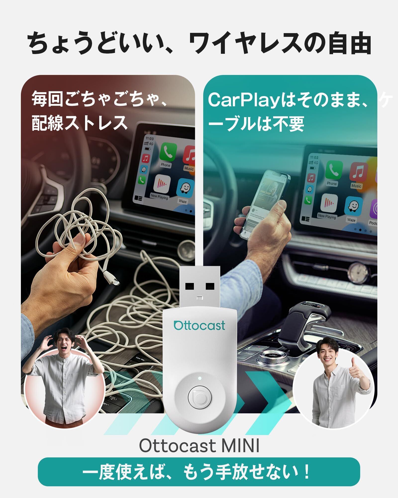 「『OTTOCAST MINI』は、あなたの車のインフォテインメントシステムを革新するワイヤレスアダプターです。コンパクトな設計で、CarPlay(カープレイ)とAndroid Auto(アンドロイドオート)を簡単に無線化することができます!」