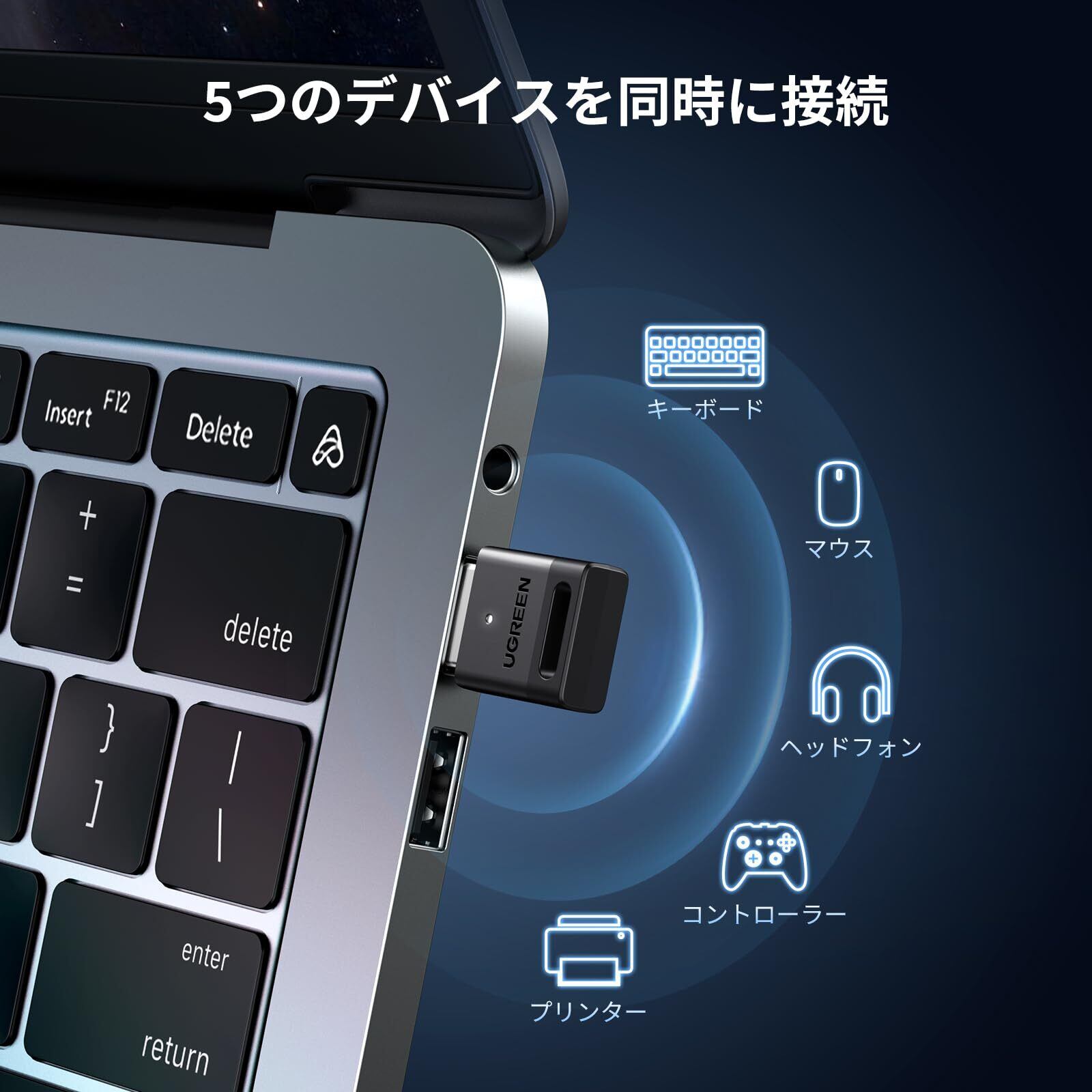 【最大5デバイスの同期接続】: UGREENのPC用Bluetoothアダプターは、Bluetoothマウス/キーボード/スマホ/ヘッドフォンなど、互いに干渉することなく同時に接続される最大5種類のBluetoothデバイスをサポートしています。※同じタイプのBluetoothオーディオデバイス(スピーカー/ヘッドフォンなど)が接続されている場合、音楽を再生できるデバイスは1つだけです。