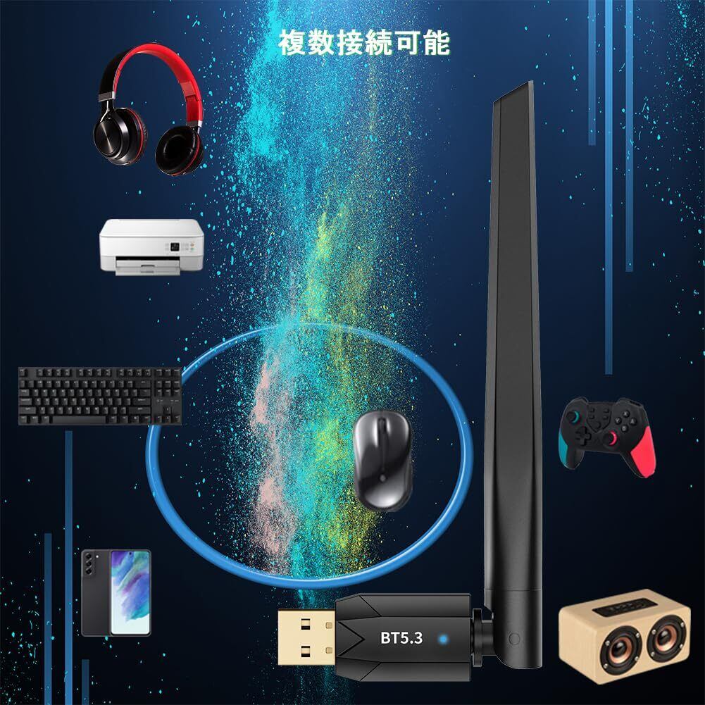 「『Bluetooth 5.3 USB アダプタ』は、最先端のBluetooth 5.3技術を搭載した高性能アダプタで、ドライバーのインストール不要で簡単に使用開始できます。Windows 11/10に対応し、あらゆるBluetoothデバイスとの接続が可能です!」